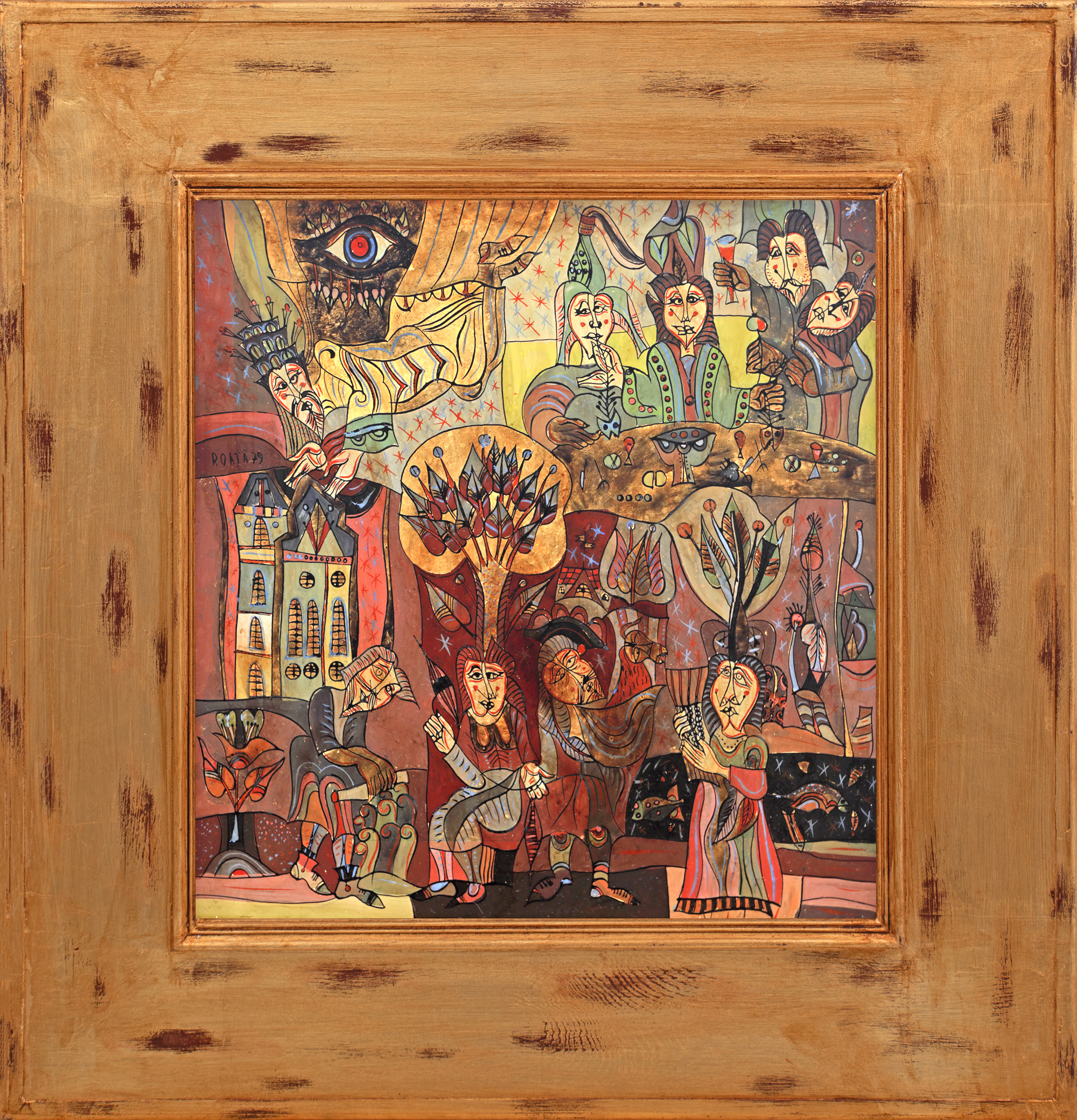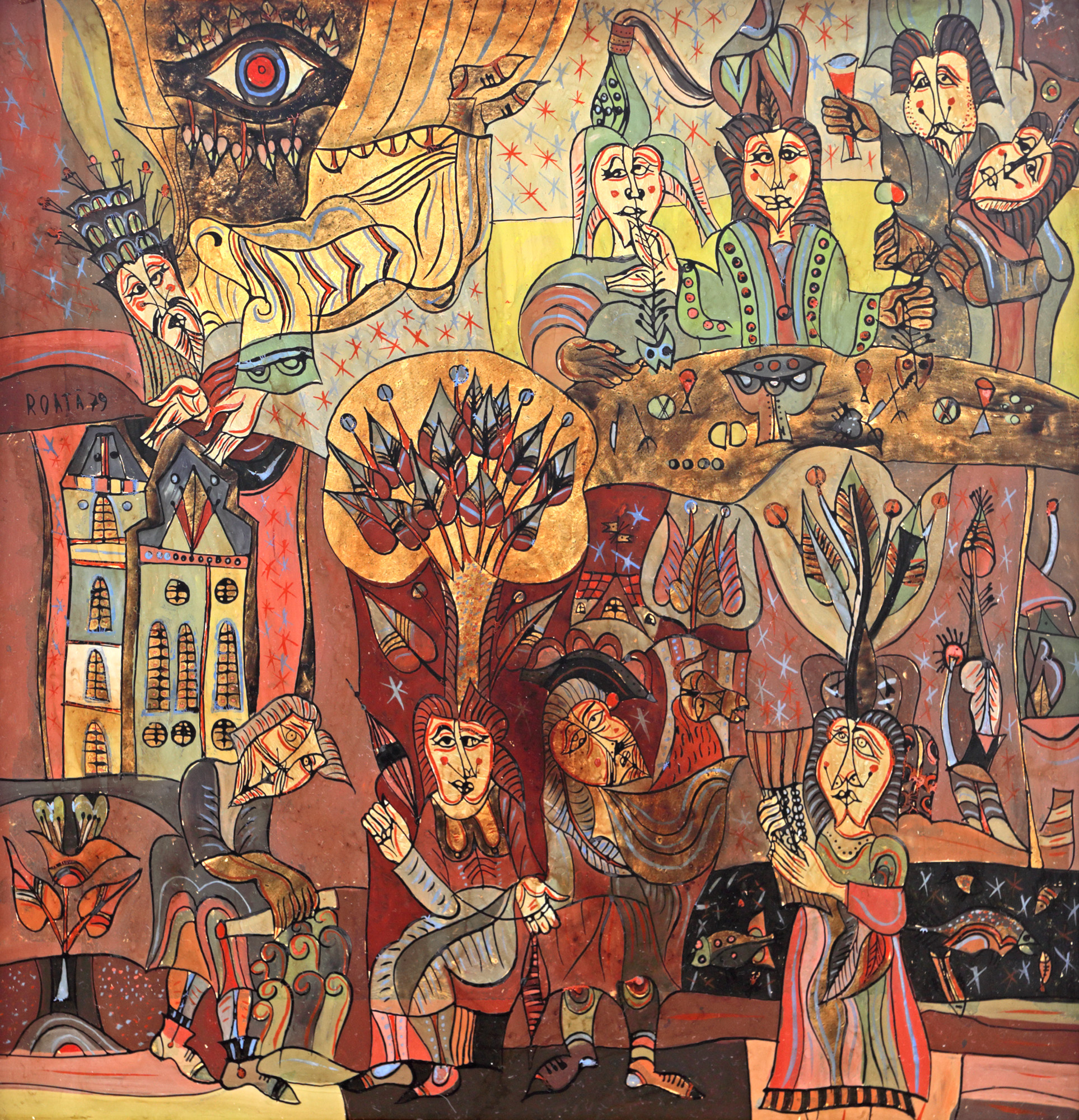 semnat și datat lateral stânga, cu negru, "ROATĂ, (19)79"; semnat, datat și intitulat pe verso, în pix, "Toma Roată, Die Geschichte, 1979"