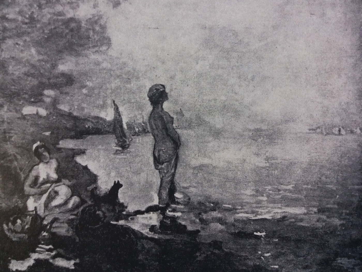 Gheorghe Petrașcu este unul dintre acei artiști pe care lumea artelor i-a răsfățat încă din timpul vieții. Elev al maestrului Grigorescu, frate al unui însemnat director de revistă și cronicar al perioadei de la 1900, Petrașcu avea să intre în rândul marilor creatori în viață relativ rapid, devenind în perioada interbelică o somitate a fenomenului artistic. Desele sale expoziții, celebrate în sălile de expoziții bucureștene, colecționarii de seamă (Dona, Adolf Ruleta, Zambaccian, Laserson, Weinberg) și evident pictura sa, toate au creat aura unui artist ce definește în bună măsură apogeul postimpresionismului românesc. Studierea peisajului petrașcian reprezintă o adevărată provocare pentru cercetărorul artei românești moderne. Specificitatea picturii lui Petrașcu ne introduce în psihologia unui artist modelat după structura marilor impresioniști, chiar dacă el însuși s-a desprins rapid, la începutul carierei, de presupusele “metehne” ale pictorilor plein-air-ului. Însă anumite elemente ce țin de chintesența picturii le recunoaștem și la maestrul lui Petrașcu, Nicolae Grigorescu. Ca urmare, o înrădăcinare în tipologiile impresioniste ale secolului al XIX-lea s-au transmis şi în “genetica” picturii lui Petrașcu. Cea mai evidentă moștenire, cea care de altfel a și reglementat itinerariile realizate de Petrașcu de-a lungul întregii sale cariere, rezidă în percepția artistului asupra motivului pictat. În cazul de față, pictorul punctează într-o manieră inedită motivul personajului feminin pe malul apei, tematică pe care o va picta începând cu primul deceniu al secolului XX. Urzită din întretăierea tematică a motivului amintit și definită de un bagaj idilic pregnant, „La scăldat” amintește de ciclul simbolist realizat de Petrașcu în jurul baigneuzelor. Peisajul se desfășoară după legile unei aparențe firești, cel puțin în ceea ce ține de formă, Petrașcu fiind atras mereu de principiile de stabilitate figurativă oferite de însăși natura. Chiar dacă pictorul nu se folosește de mici notații artificiale pentru a imprima ritm, planurile sunt astfel modelate spre a atinge o picturalitate echilibrată, dar expresivă. Cerul primește o încărcătură materială, oferind registrului superior aspecte scenografice, fiind responsabil de atingerea unei coerențe volumetrice. Personajele din prim-plan, pictate cu iz romantic sunt recurente, Petrașcu integrându-le și alte în opere realizate la circa 20 ani distanță ca „Nud la marginea apei” 1931 (Licitația de Iarnă Artmark 2016, lot. 192) și „Seara la malul mării” 1913 (M.N.A.R.). Realizată la Târgoviște, nu putem presupune decât că Petrașcu își imaginează compoziția, fiind puțin posibil ca o astfel de scenă să fi fost cu adevărat „regizată” de Petrașcu în 1931.(I.P.)