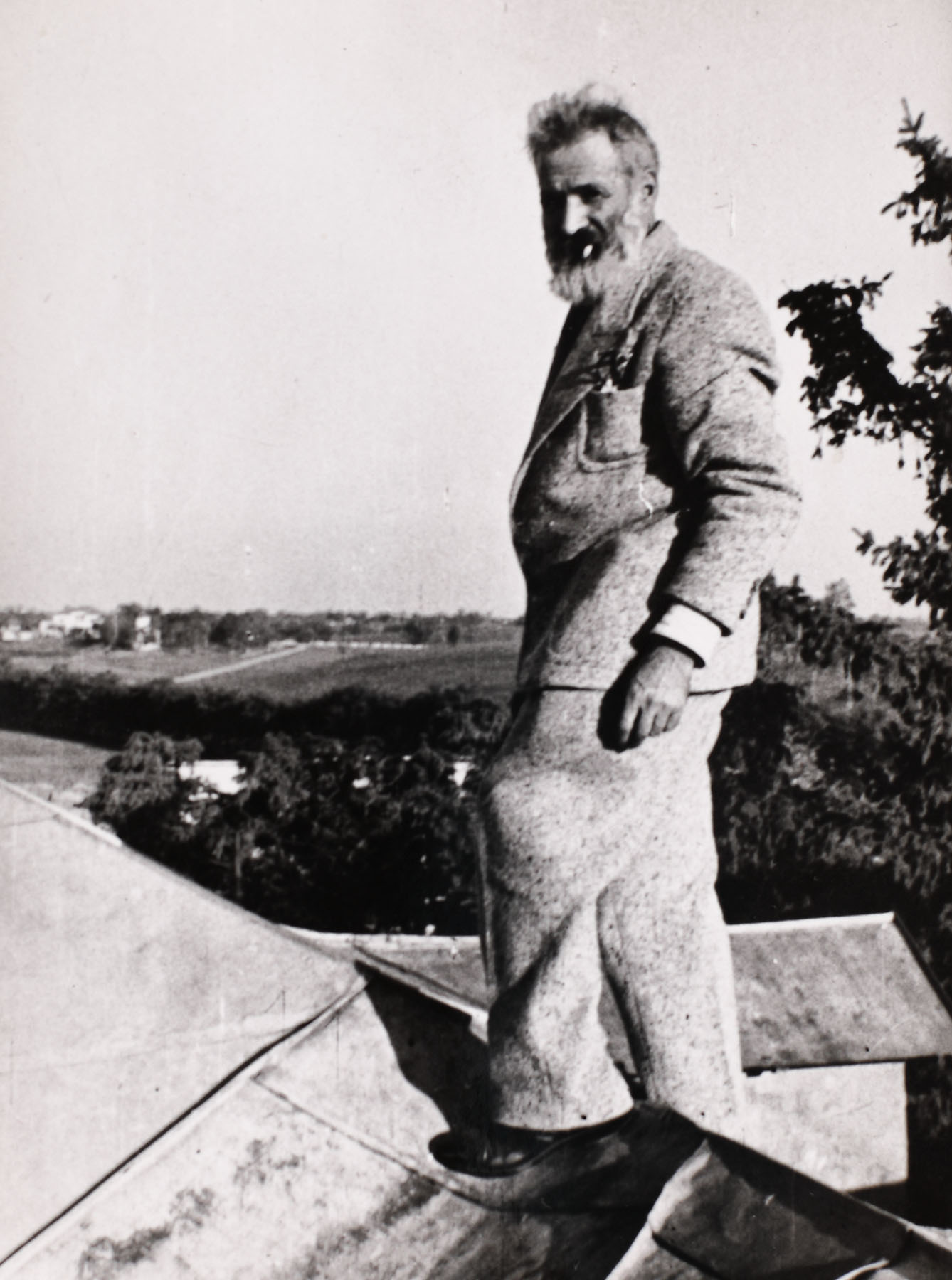 61. Fotografie inedită înfățișându-l pe Constantin Brâncuși pe acoperișul casei familiei Gerota, la Săftica, provine din colecția criticului de artă Barbu Brezianu [cca. 1937]