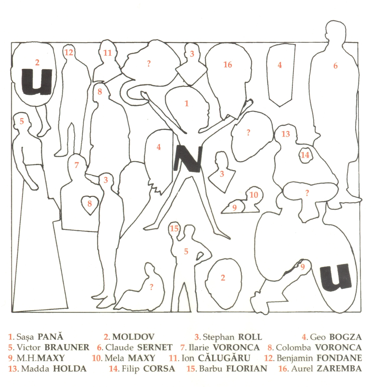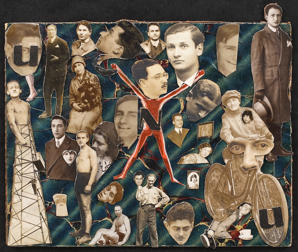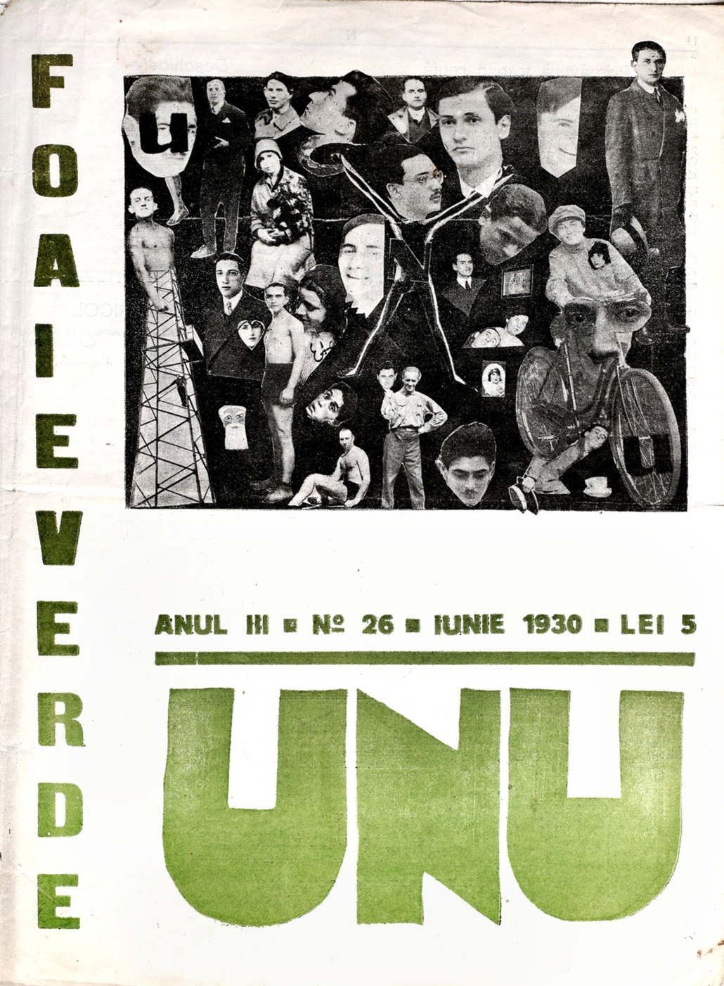 87. UNU (Foaie Verde), colajul original apărut apoi în revista UNU nr. 26 (Sașa Pană, Victor Brauner, M.H. Maxy, Madda Holda, Moldov, Claude Sernet, Mela Maxy, Filip Corsa, Stephan Roll, Ilarie Voronca, Ion Călugăru, Barbu Florian, Geo Bogza, Colomba Voronca, Benjamin Fondane, Aurel Zaremba) [1930]