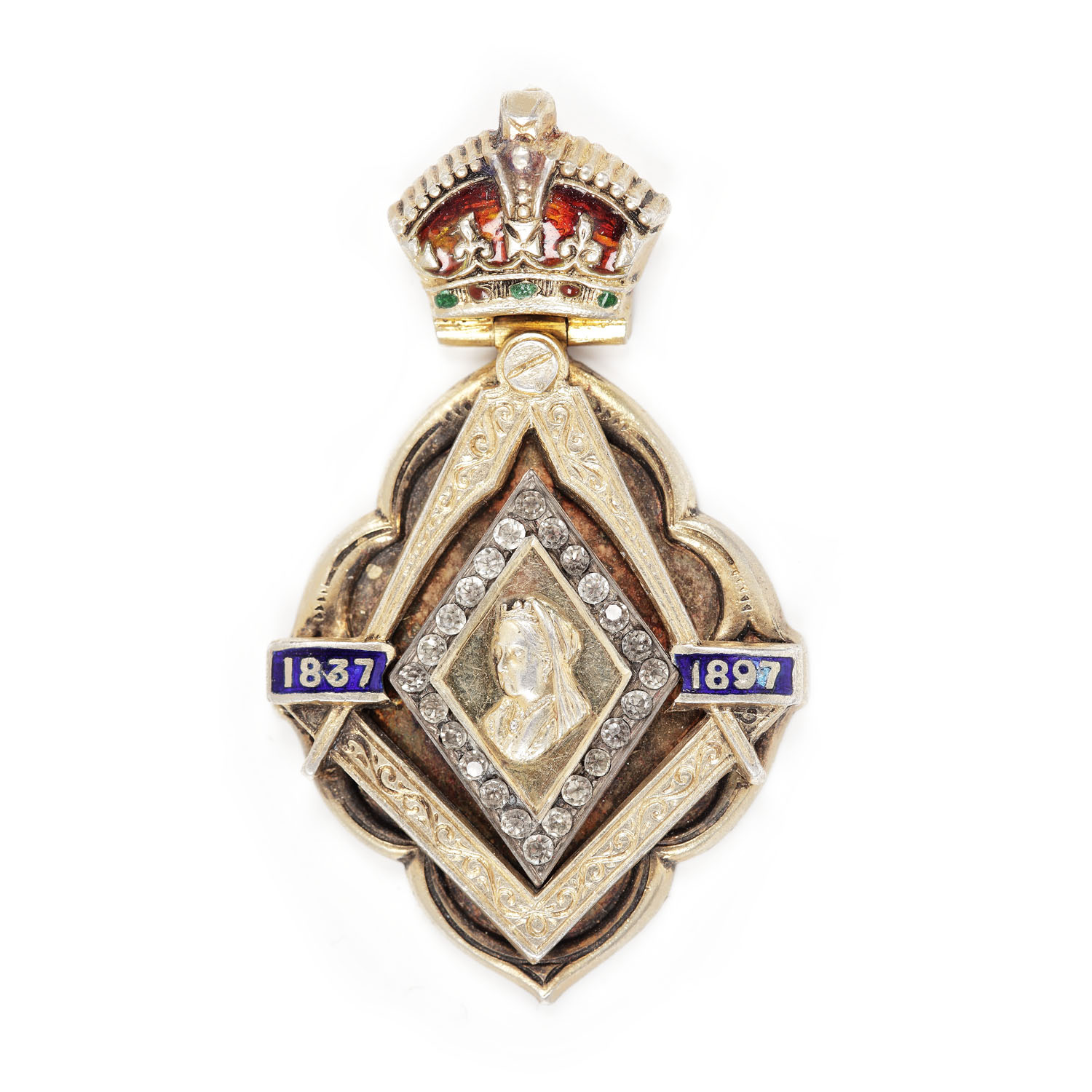 59. Bijuterie masonică din argint, decorată cu însemne masonice, surmontat de coroana regală