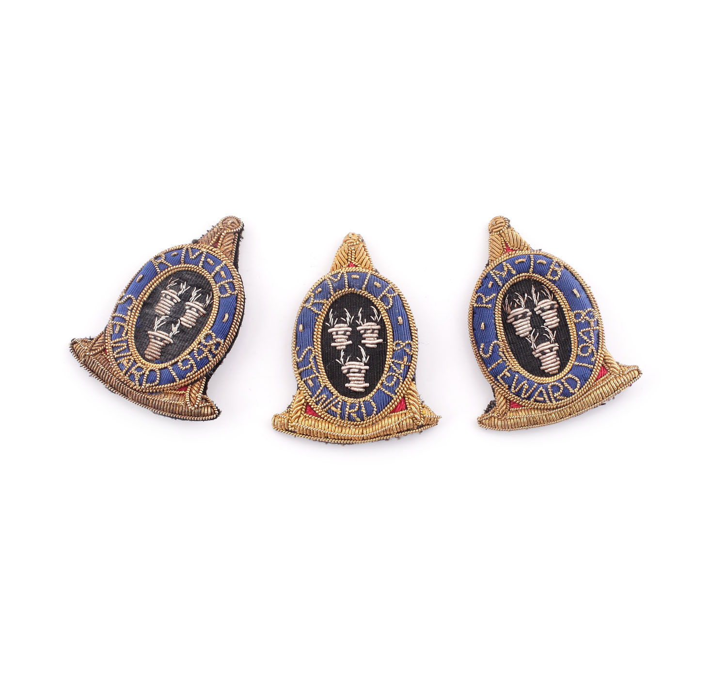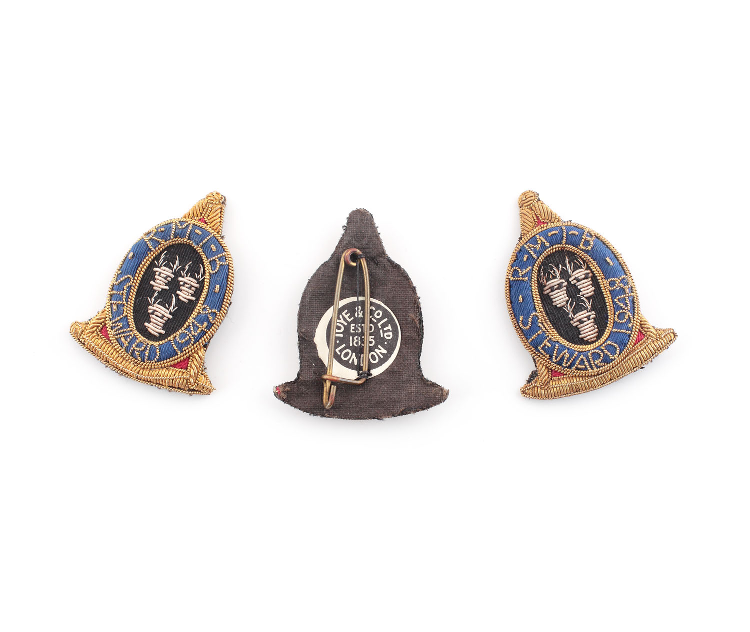 64. Lot format din trei insigne masonice ale ”Royal Masonic Institution For Boys”, pentru funcţia de Steward, 1948