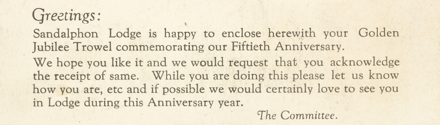 În cutie se află mesajul: ”Loja Sandalphon este fericită să vă înmâneze Mistria Jubiliară de Aur care comemorează cea de-a 50-a aniversare a noastră. Sperăm că vă place și ne-ar face deosebită plăcere să ne spuneți părerea dumneavoastră. În timp ce faceți acest lucru, vă rugăm să ne spuneți cum sunteți, etc și, dacă este posibil, cu siguranță ne-ar plăcea să vă vedem în Lojă în acest an aniversar.”
