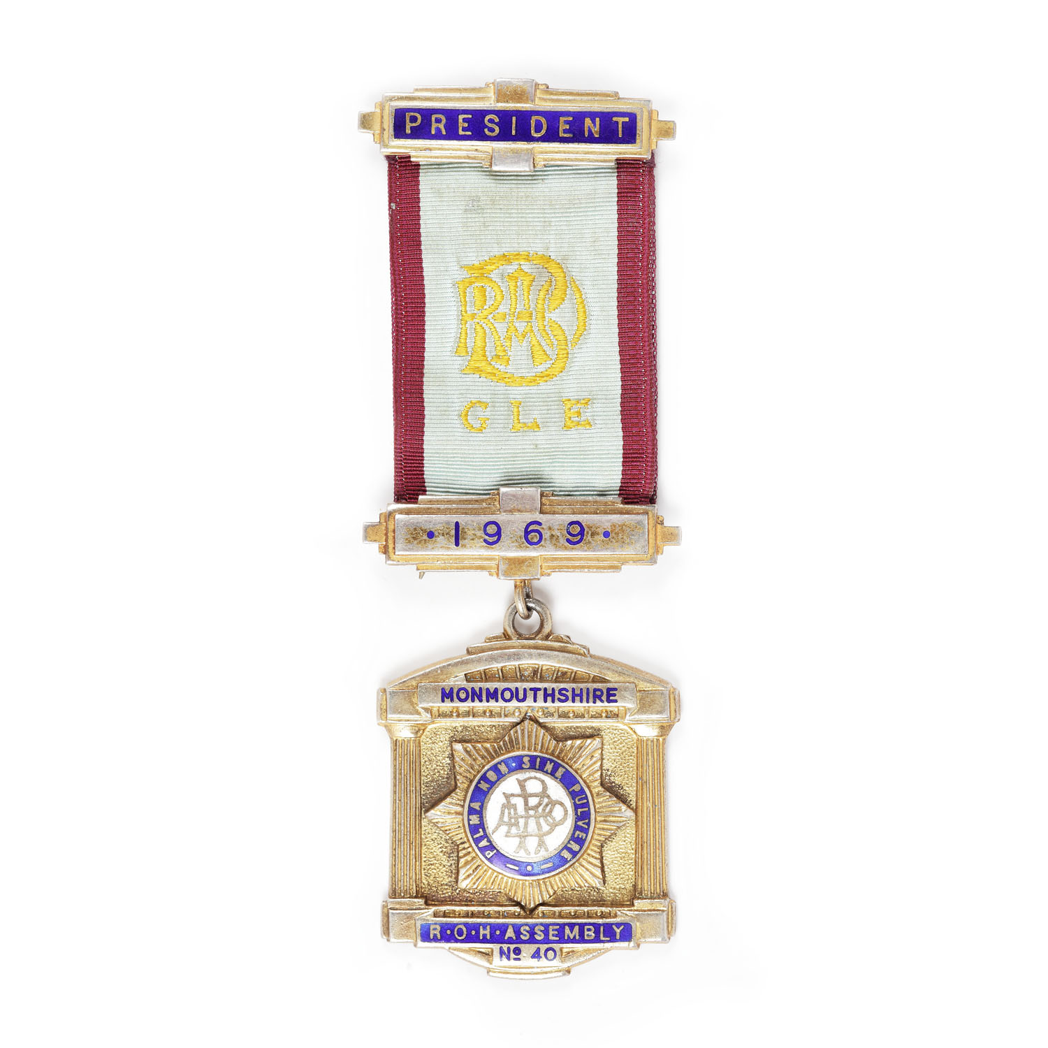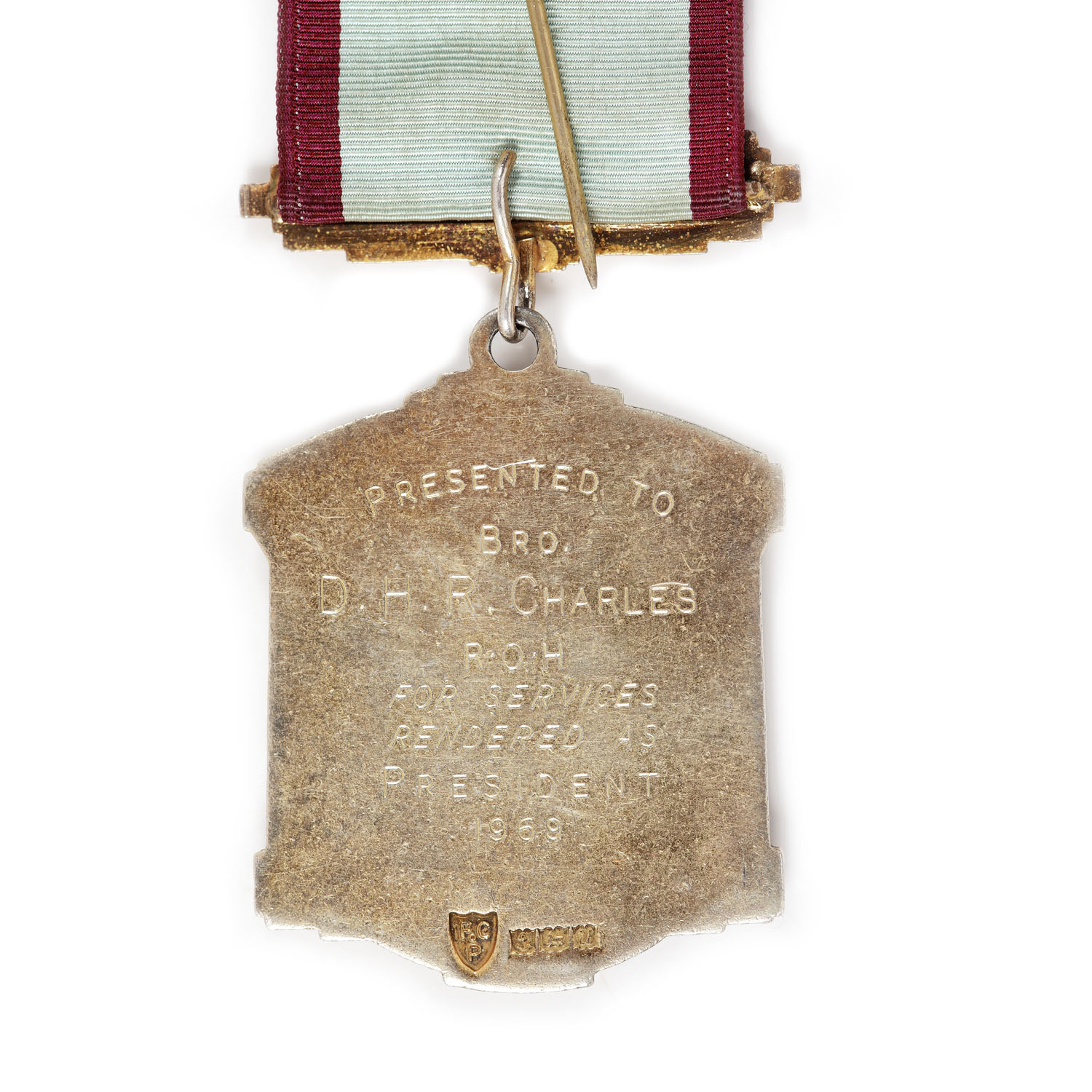 73. Ordin masonic din argint aurit al ”R.A.O.B.”, prezentat lui D.H.R. Charles pentru funcţia de Preşedinte şi gradul Roll of Honour, Monmouthshire, 1969