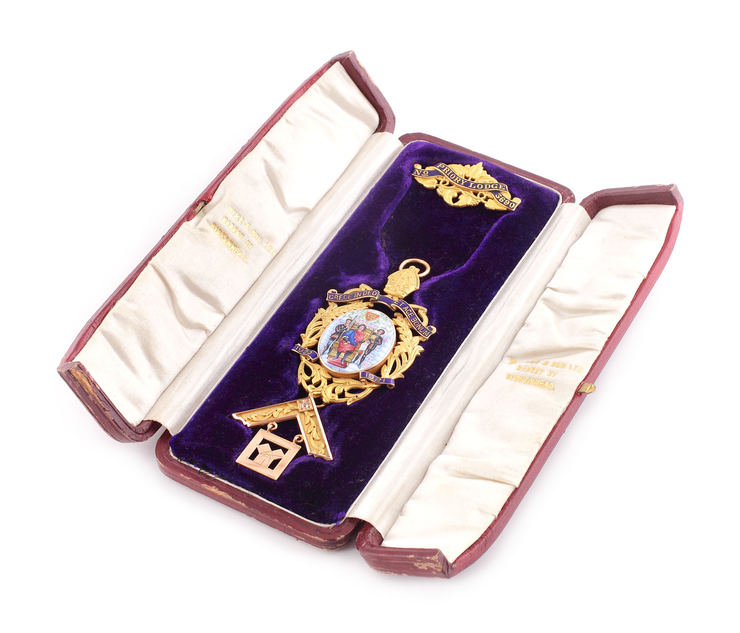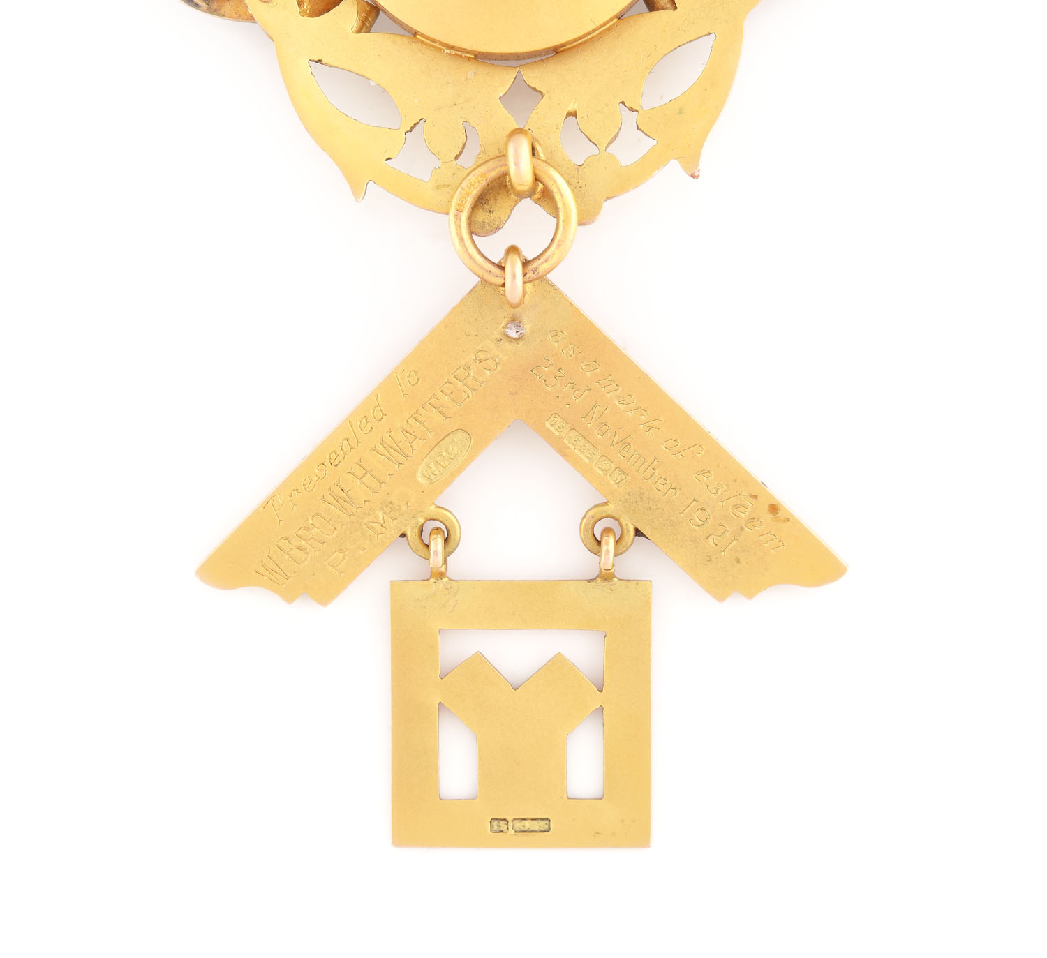 Oferit către P.M (Past Master), W. Bro. (Worshipful Brother), W.H. Watters, în semn de recunoştinţă la data de 23 noiembrie 1921. Piesă oferită de loja "Priory, nr. 3690", regiunea Cheshire, Anglia.