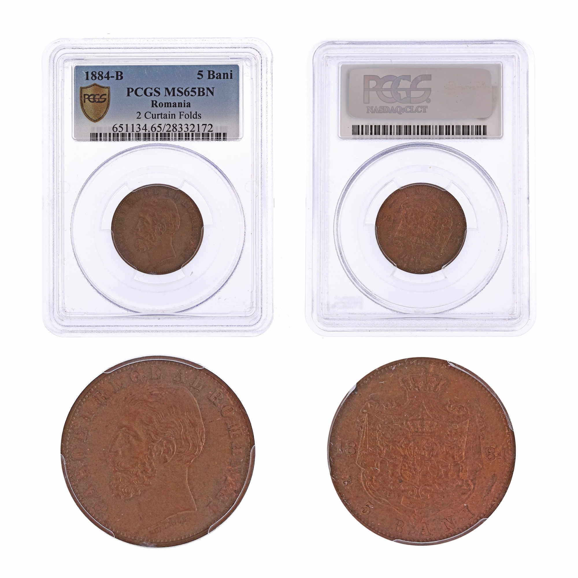 80. Moneda 5 Bani 1884B, MS 65 BN, cu două cute la draperie