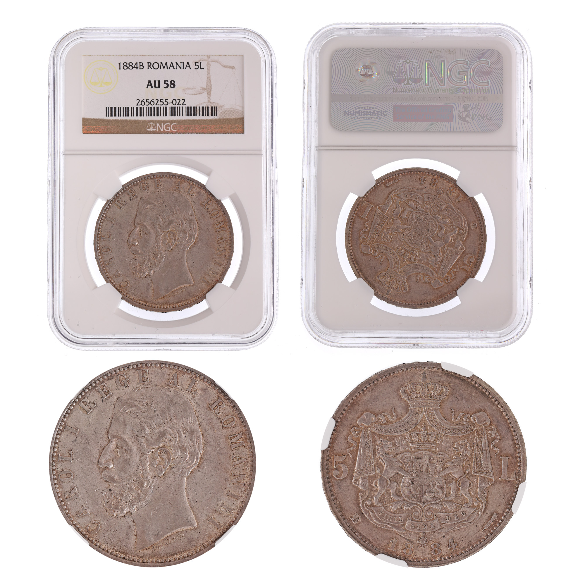 83. Moneda 5 Lei 1884B, AU 58, cu revers deviat, argint
