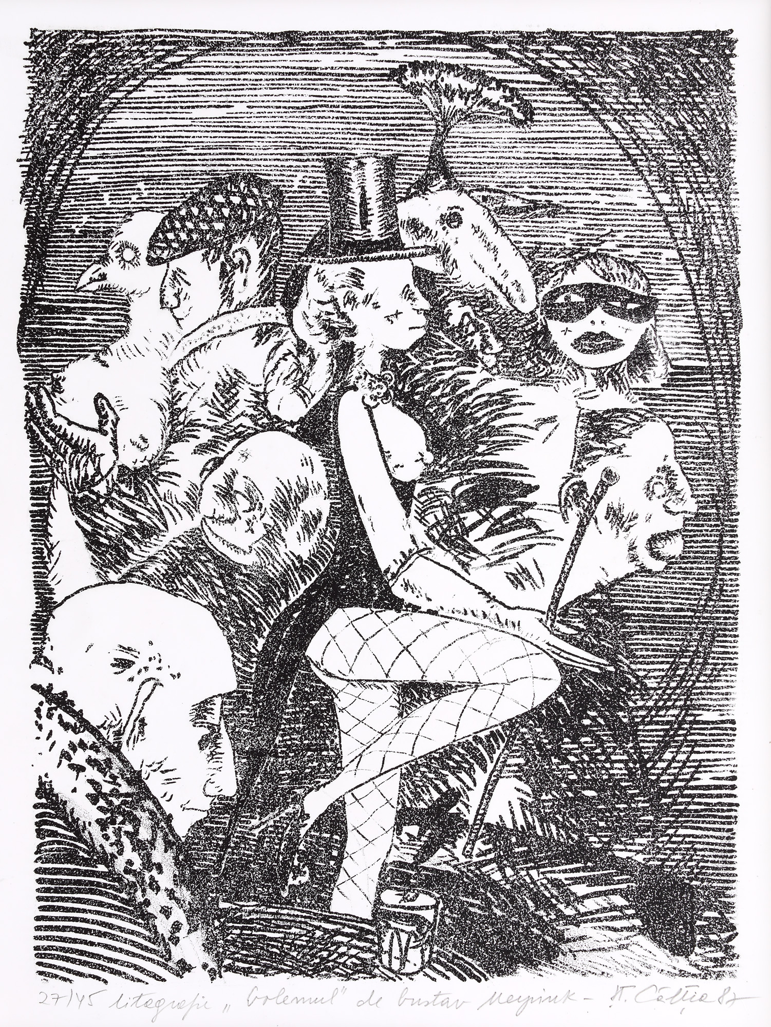 semnat, datat, intitulat, numerotat și notat central jos, în creion, "Șt. Câlția, (19)87, Golemul de Gustav Meyrink, 27/45"