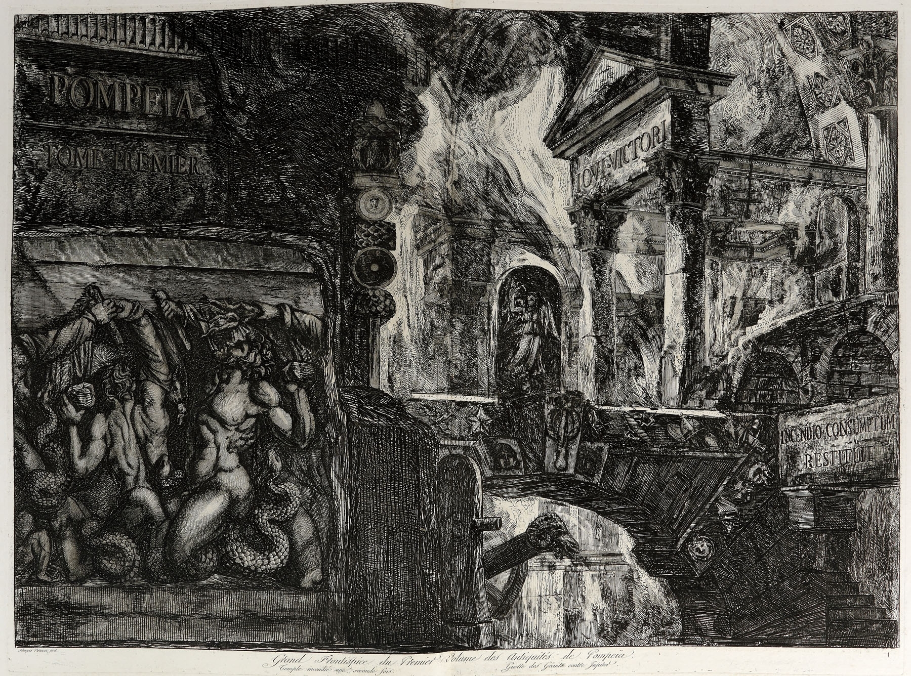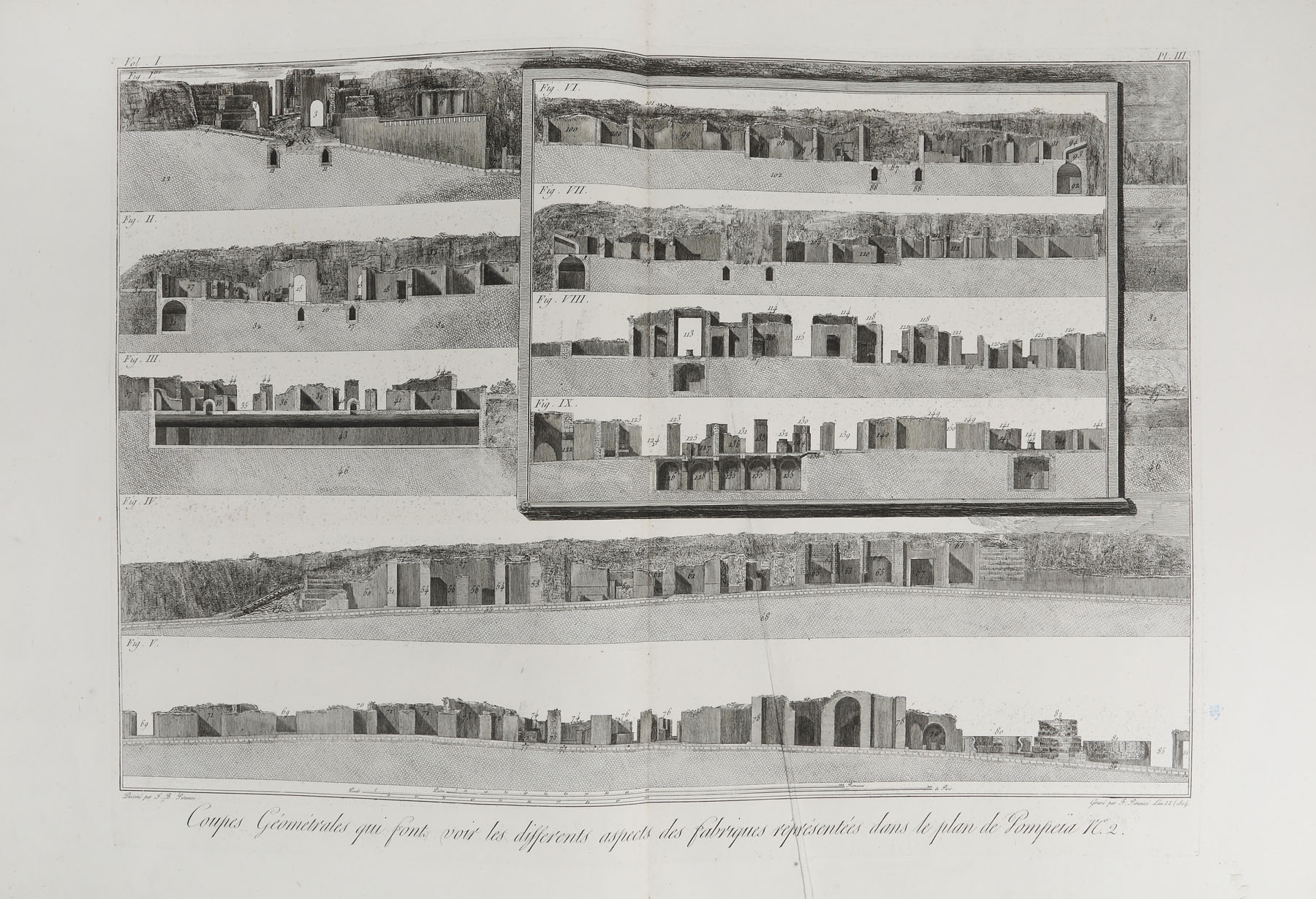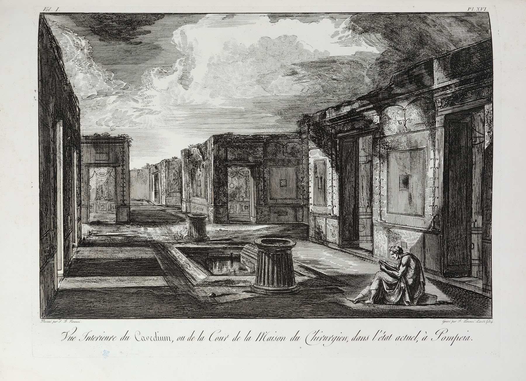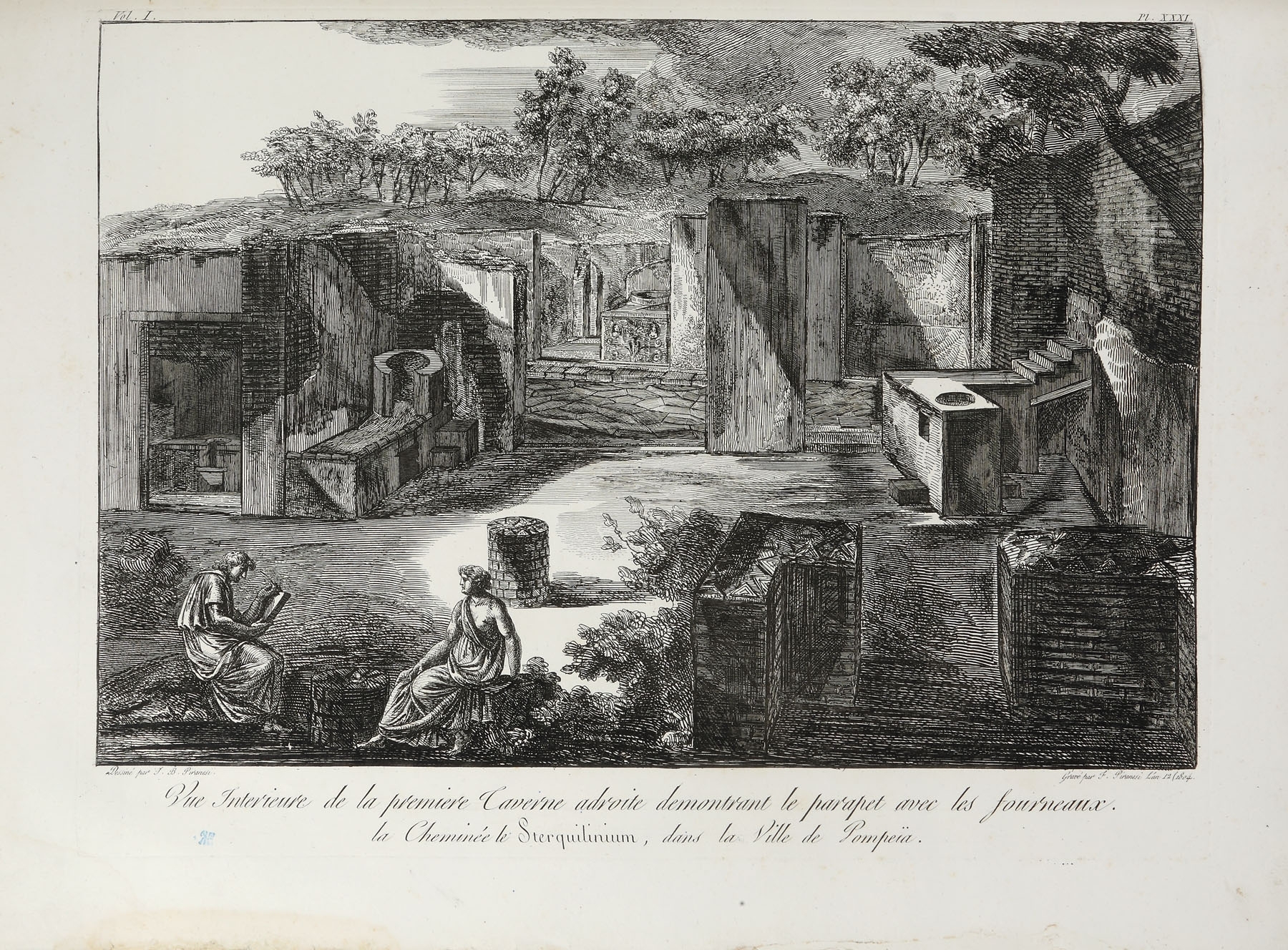 Album de gravuri: "ANTIQUITES DE POMPEIA". TOME PREMIER. Autor: Piranesi Francesco (1758/9 - 1810), după Piranesi Giovanni Battista (1720 - 1778). Conţine un total de 36 planşe gravate: o planşă gravată frontispiciu, inscripţie jos mijloc: "Grand Frontispice du Premier volume des Antiquites de Pompeia / Temple incendie une seconde fois. Guerre des Geants contre Jupiter"; stg. jos: Frangois Piranesi fecit.; o planşă cu text gravat: "Table du premier volume des antiquites de Pompeia", inscripţie dr. jos: "Md Baud Sculpsit"; 34 planşe gravate numerotate I - XXXV (planşa IV inexistentă) reprezentând vederi, planuri, vestigii, inscripţii antice. Toate plăcile după care s-au imprimat planşele au fost retuşate. Dintre cele 36 planşe gravate, 14 au dimensiuni duble, fiind imprimate pe două bucăţi de hârtie lipite între ele. Album legat în coperţi de carton îmbrăcate în hârtie marmorată. Volumul a făcut parte din colecţia conţilor Bezborodko şi Koucheleff (secolul XIX), colecţie parţial vândută în 1869. Cea mai mare parte a acestei colecţii a fost donată Academiei de Arte Frumoase din Sankt Petersburg. Între anii 1930-1931 guvernul sovietic a vândut o parte dintre desene şi gravuri pe piaţa europeană. Francesco Piranesi a editat planşele rămase de la tatăl său Giovanni Battista Piranesi, dar a completat seria antichităţilor cu propriile sale gravuri după desenele acestuia. Volumul este prima partea a lucrării „Antiquites de la grande Grèce, aujourd'hui Royaume de Naples, gravées par F. Piranesi d'aprés des dessins et observations de J. B. Piranesi, redigées et expliquées par Ant.-Jos. Guattani, Paris, 1804-1807”. Ca şi celelalte albume de gravuri ale lui Piranesi seria de antichităţi a fost editată de multe ori, până ce planşele au intrat în colecţia calcografiei din Roma unde au fost imprimate ultimele tiraje marcate cu sigiliul à sec al calcografiei. Albumul expertizat provine dintr-un tiraj de după anul 1810.