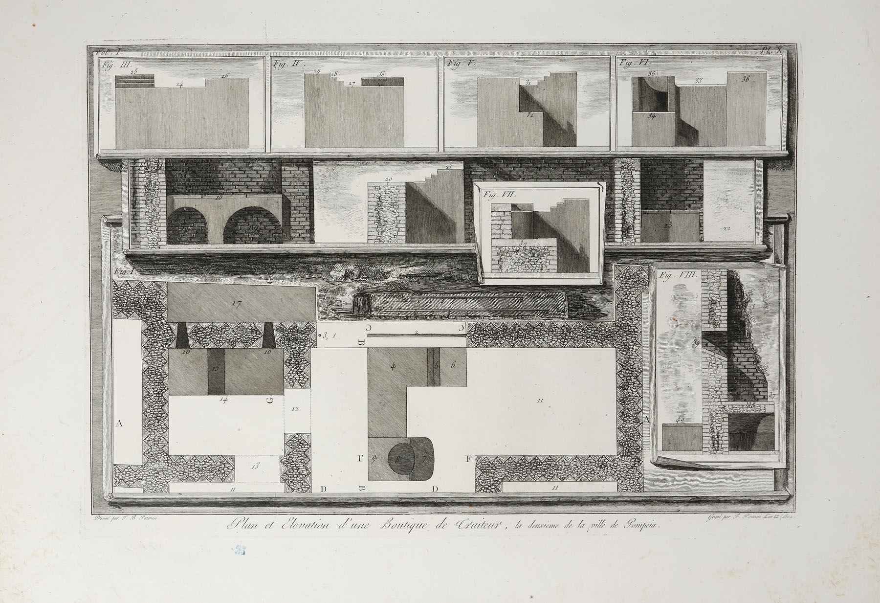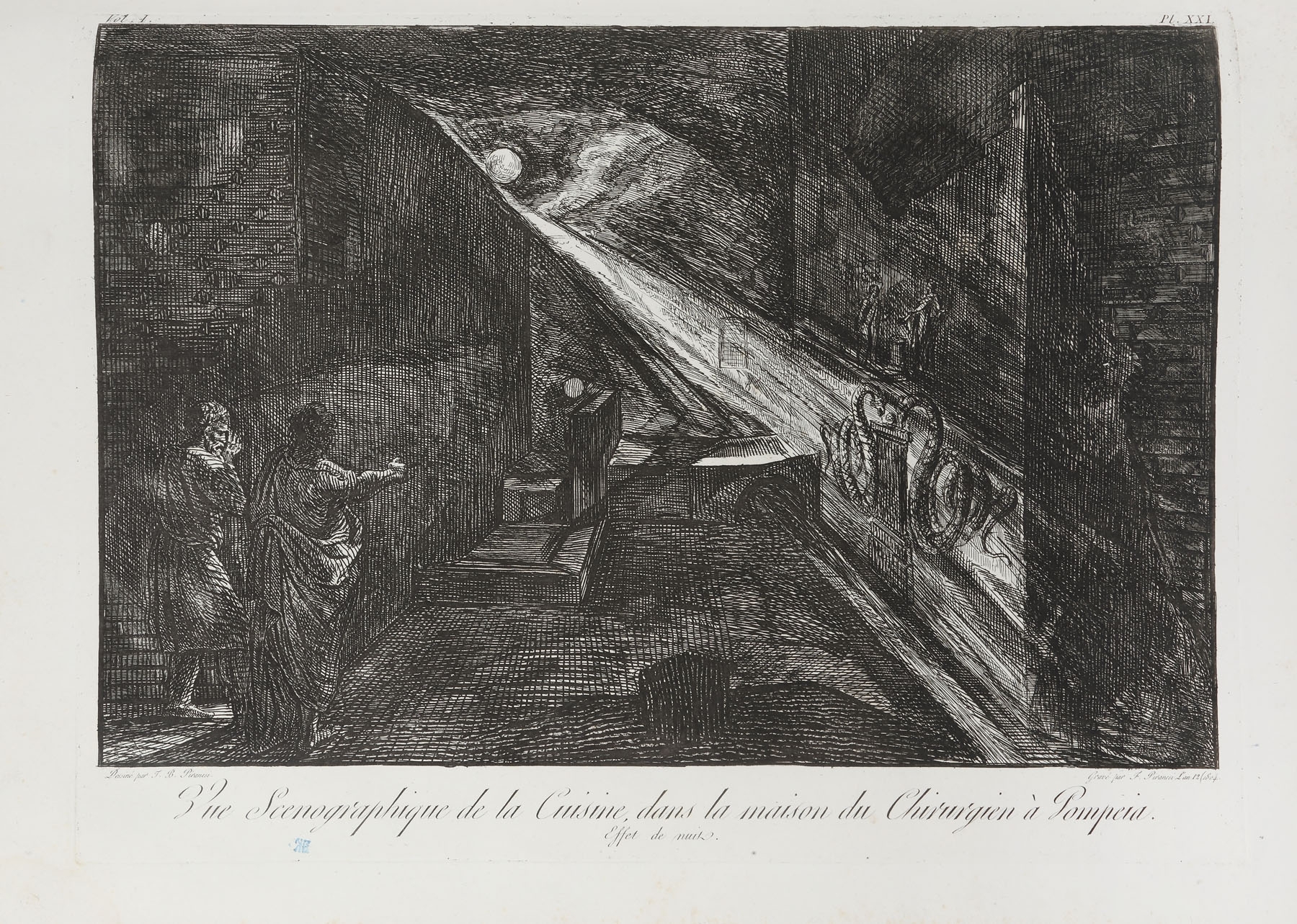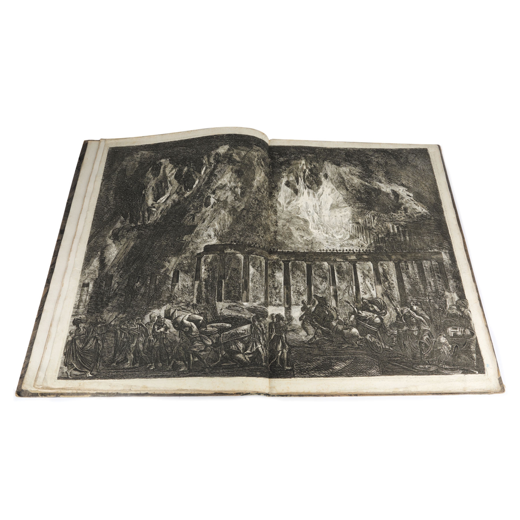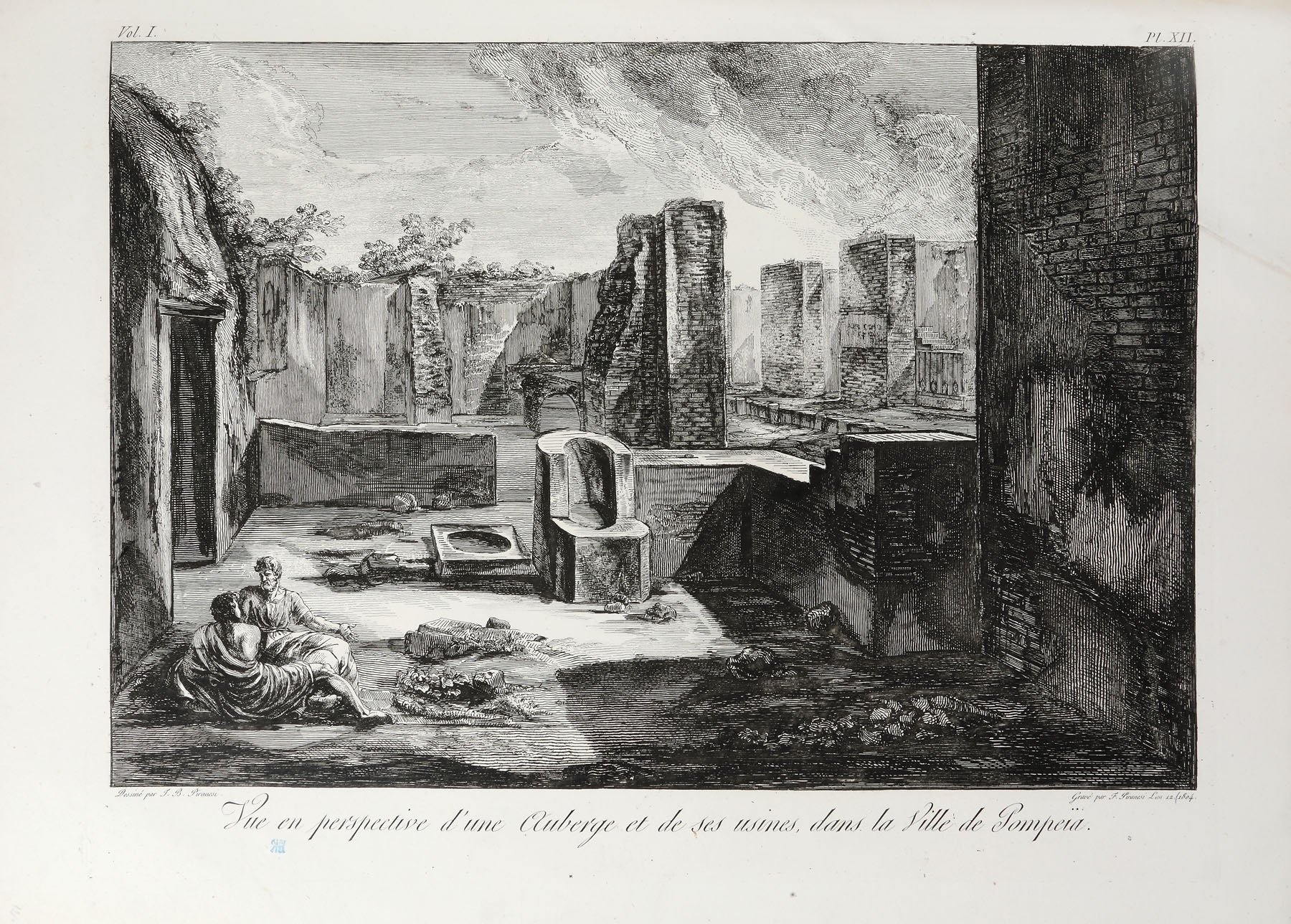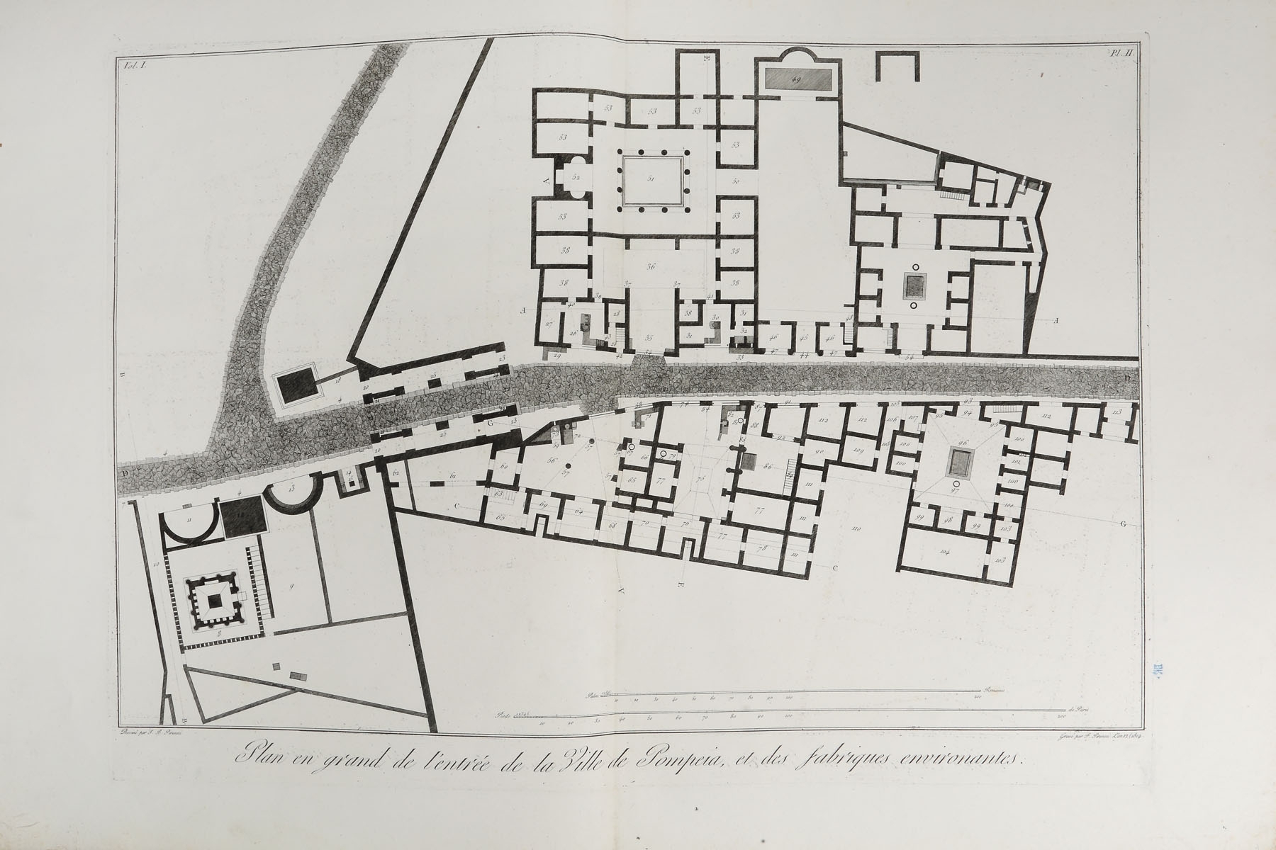 Album de gravuri: "ANTIQUITES DE POMPEIA". TOME PREMIER. Autor: Piranesi Francesco (1758/9 - 1810), după Piranesi Giovanni Battista (1720 - 1778). Conţine un total de 36 planşe gravate: o planşă gravată frontispiciu, inscripţie jos mijloc: "Grand Frontispice du Premier volume des Antiquites de Pompeia / Temple incendie une seconde fois. Guerre des Geants contre Jupiter"; stg. jos: Frangois Piranesi fecit.; o planşă cu text gravat: "Table du premier volume des antiquites de Pompeia", inscripţie dr. jos: "Md Baud Sculpsit"; 34 planşe gravate numerotate I - XXXV (planşa IV inexistentă) reprezentând vederi, planuri, vestigii, inscripţii antice. Toate plăcile după care s-au imprimat planşele au fost retuşate. Dintre cele 36 planşe gravate, 14 au dimensiuni duble, fiind imprimate pe două bucăţi de hârtie lipite între ele. Album legat în coperţi de carton îmbrăcate în hârtie marmorată. Volumul a făcut parte din colecţia conţilor Bezborodko şi Koucheleff (secolul XIX), colecţie parţial vândută în 1869. Cea mai mare parte a acestei colecţii a fost donată Academiei de Arte Frumoase din Sankt Petersburg. Între anii 1930-1931 guvernul sovietic a vândut o parte dintre desene şi gravuri pe piaţa europeană. Francesco Piranesi a editat planşele rămase de la tatăl său Giovanni Battista Piranesi, dar a completat seria antichităţilor cu propriile sale gravuri după desenele acestuia. Volumul este prima partea a lucrării „Antiquites de la grande Grèce, aujourd'hui Royaume de Naples, gravées par F. Piranesi d'aprés des dessins et observations de J. B. Piranesi, redigées et expliquées par Ant.-Jos. Guattani, Paris, 1804-1807”. Ca şi celelalte albume de gravuri ale lui Piranesi seria de antichităţi a fost editată de multe ori, până ce planşele au intrat în colecţia calcografiei din Roma unde au fost imprimate ultimele tiraje marcate cu sigiliul à sec al calcografiei. Albumul expertizat provine dintr-un tiraj de după anul 1810.