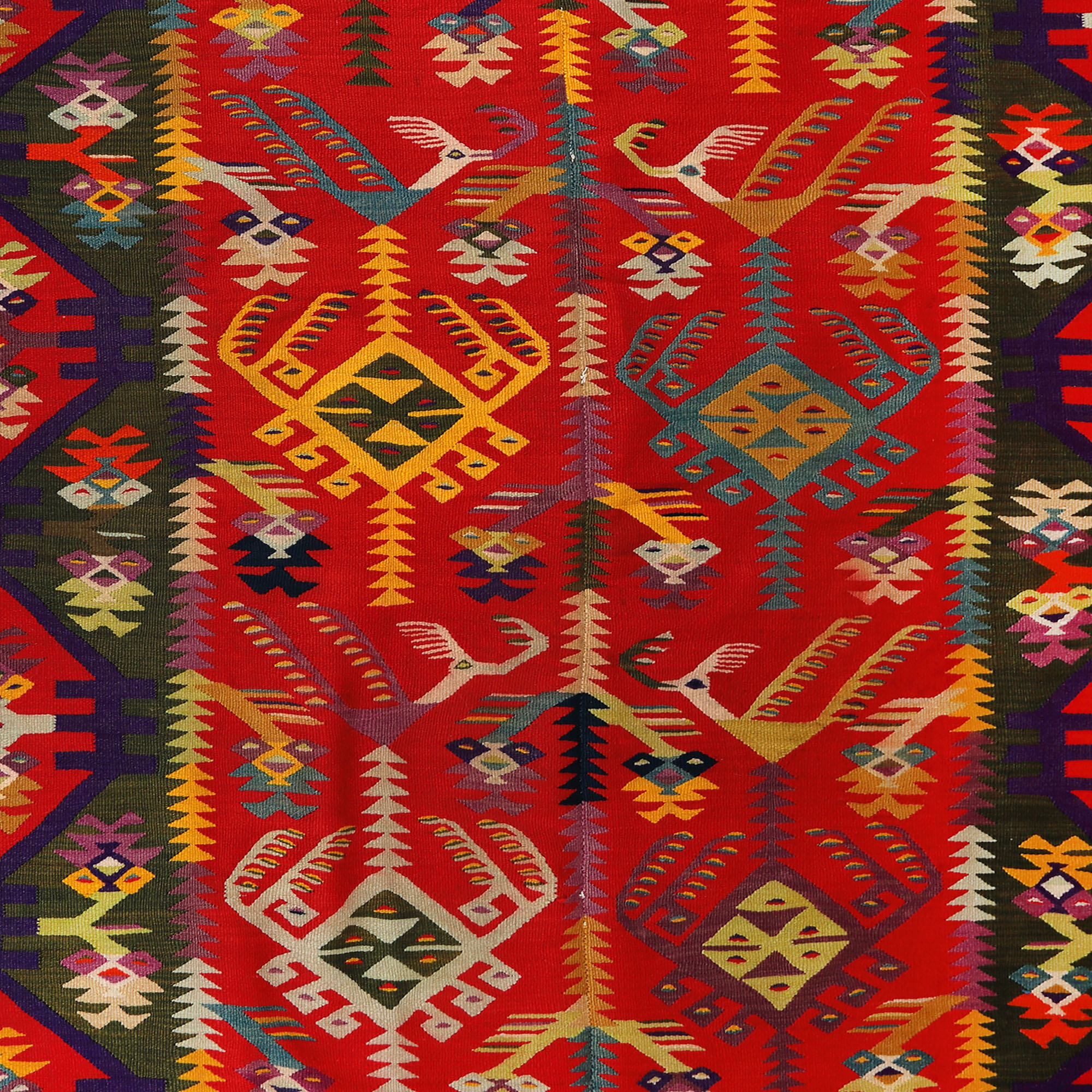 97. Covor oltenesc din lână, decorat cu motive floral-vegetale și zoomorfe, prima jumătate a sec. XX