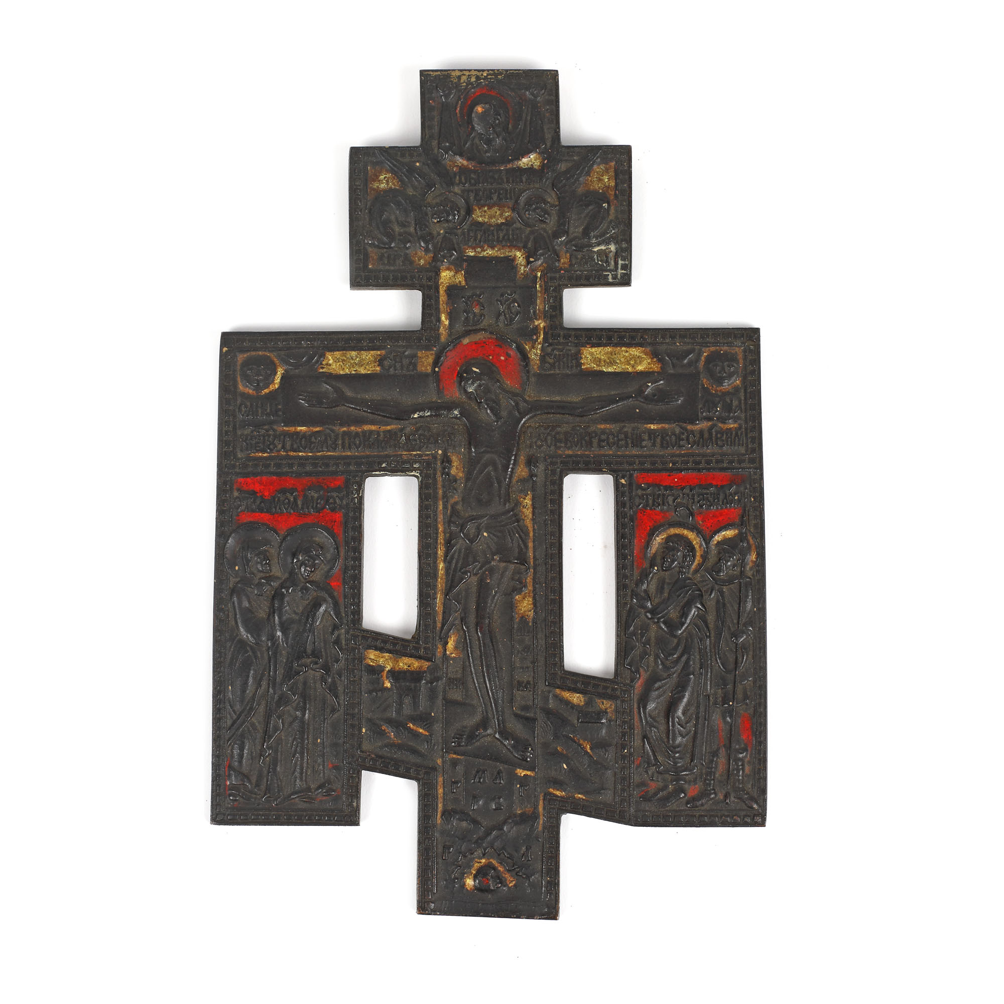 54. Cruce de mână din alamă, decorată cu email, "Iisus Răstignit", atelier rusesc, sec. XIX