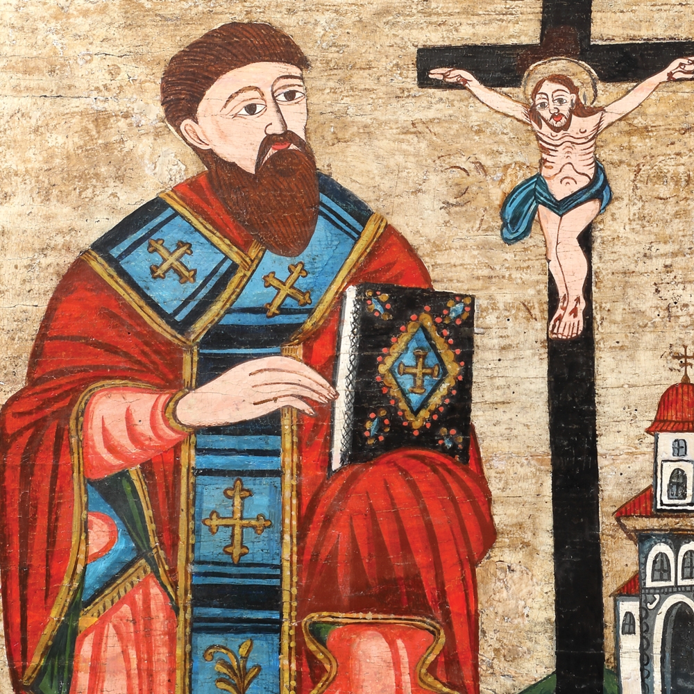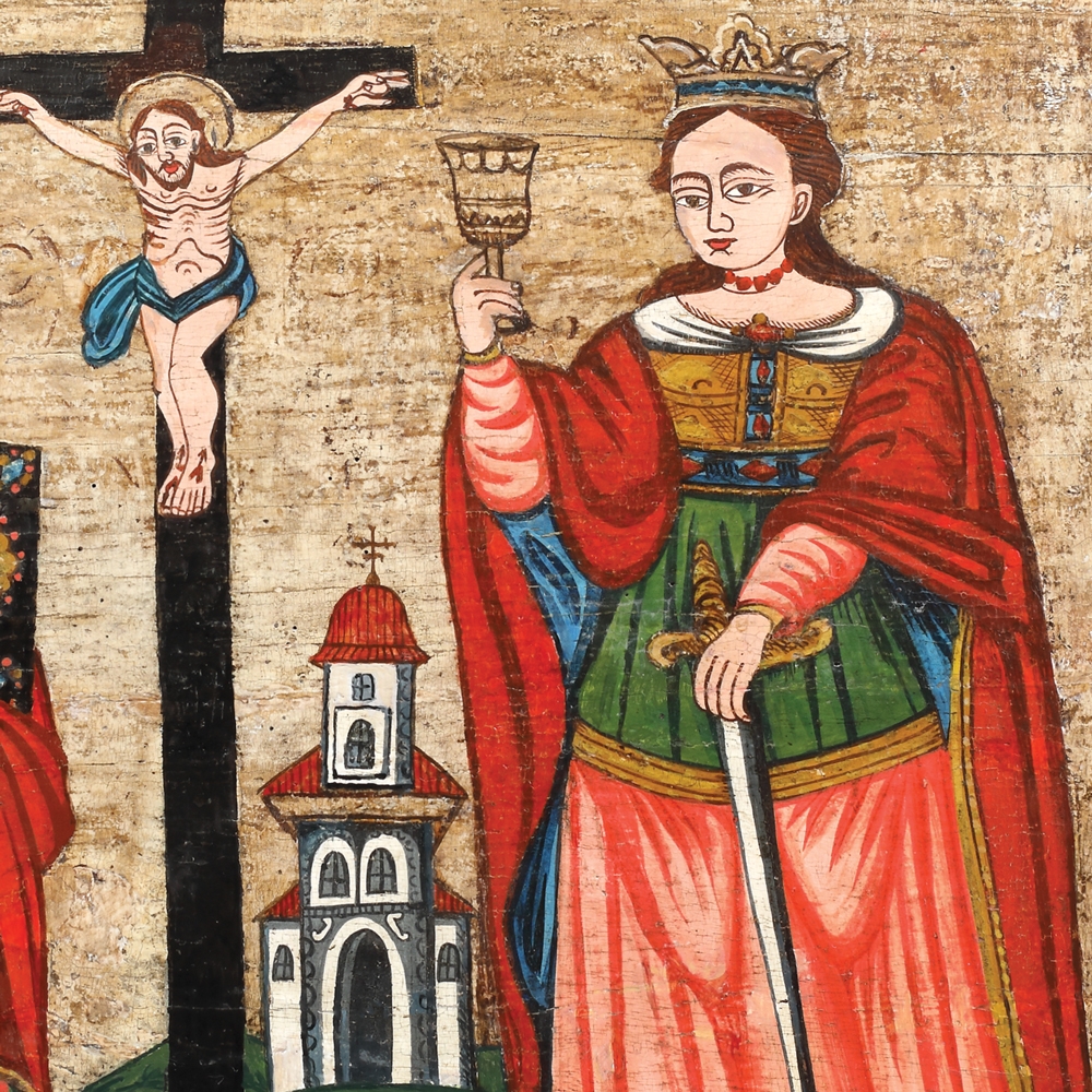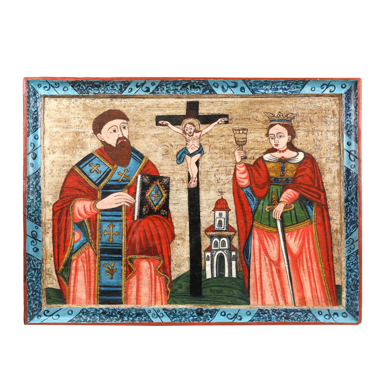86. Icoană împărătească pe lemn, ”Iisus Răstignit, Sfântul Ierarh Vasile și Sfânta Varvara”, ramă pictată, școală transilvăneană, prima jumătate a sec. XIX