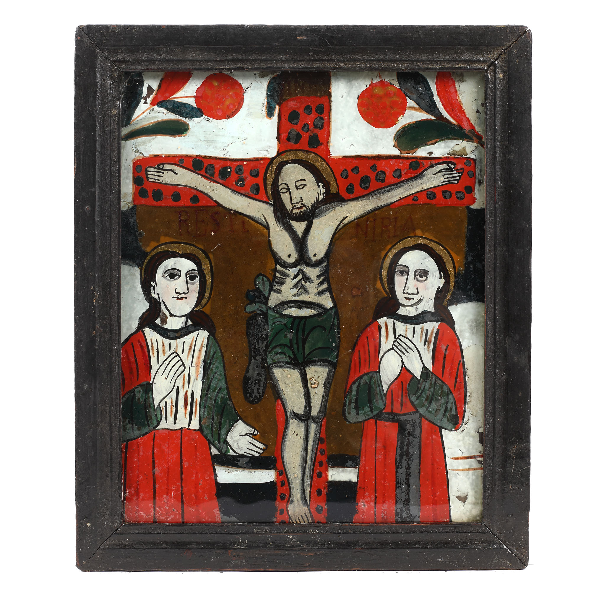 126. Icoană pe glajă, ”Răstignirea Domnului”, atelier din Nicula, sfârșitul sec. XIX - începutul sec. XX