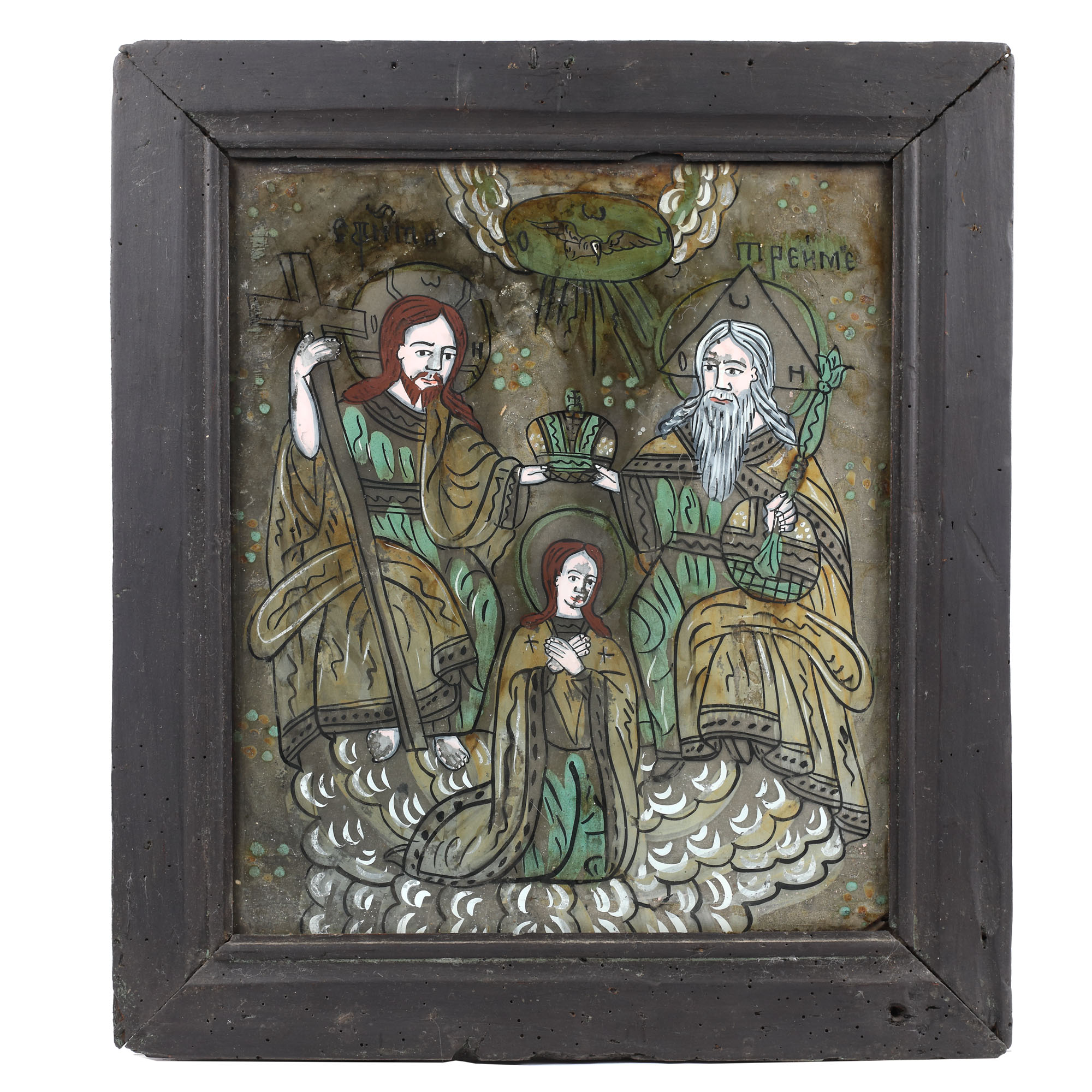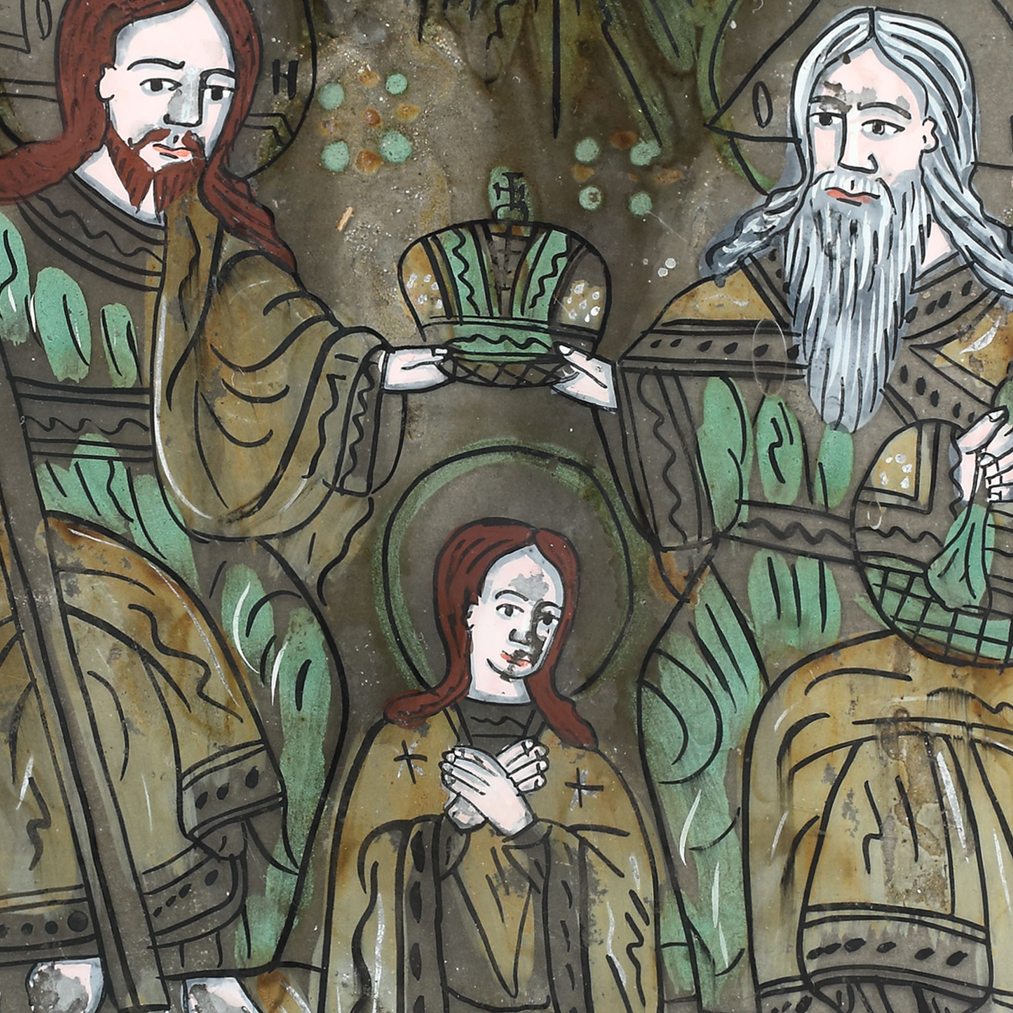121. Icoană pe glajă, ”Sfânta Treime (Încoronarea Maicii Domnului)”, atribuit zugrav Nicolae Oancea din Vale, prima jumătate a sec. XIX