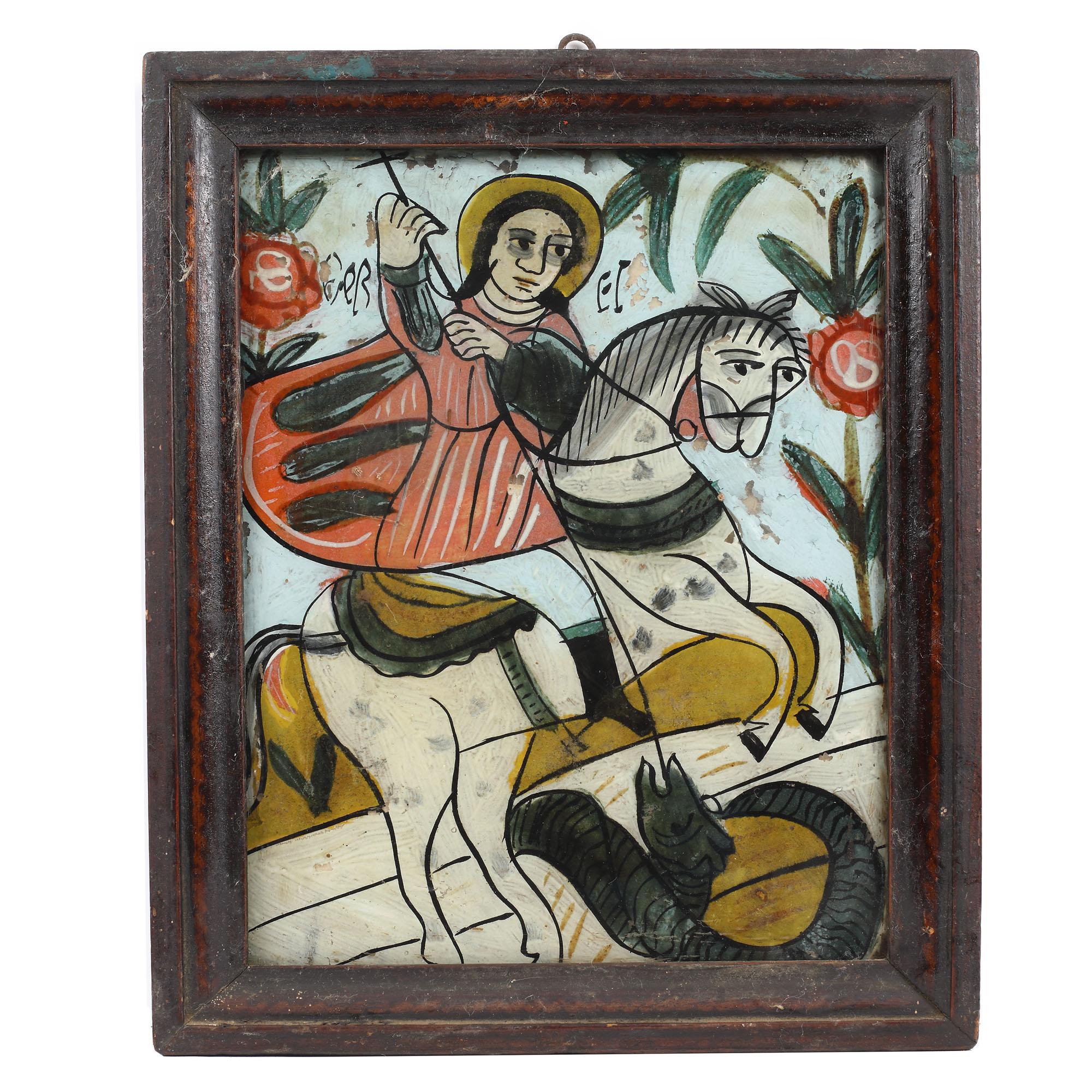 79. Icoană pe glajă, "Sfântul Gheorghe omorând balaurul", atelier din Nicula, sfârșitul sec. XIX