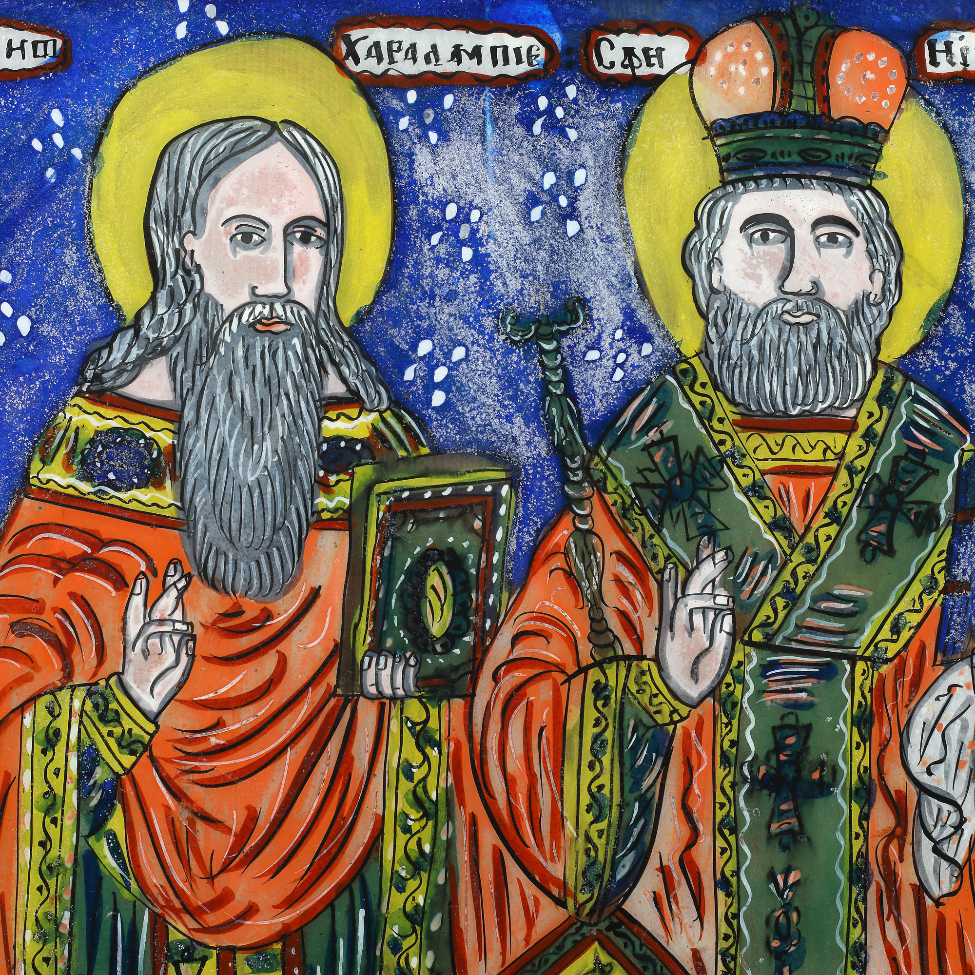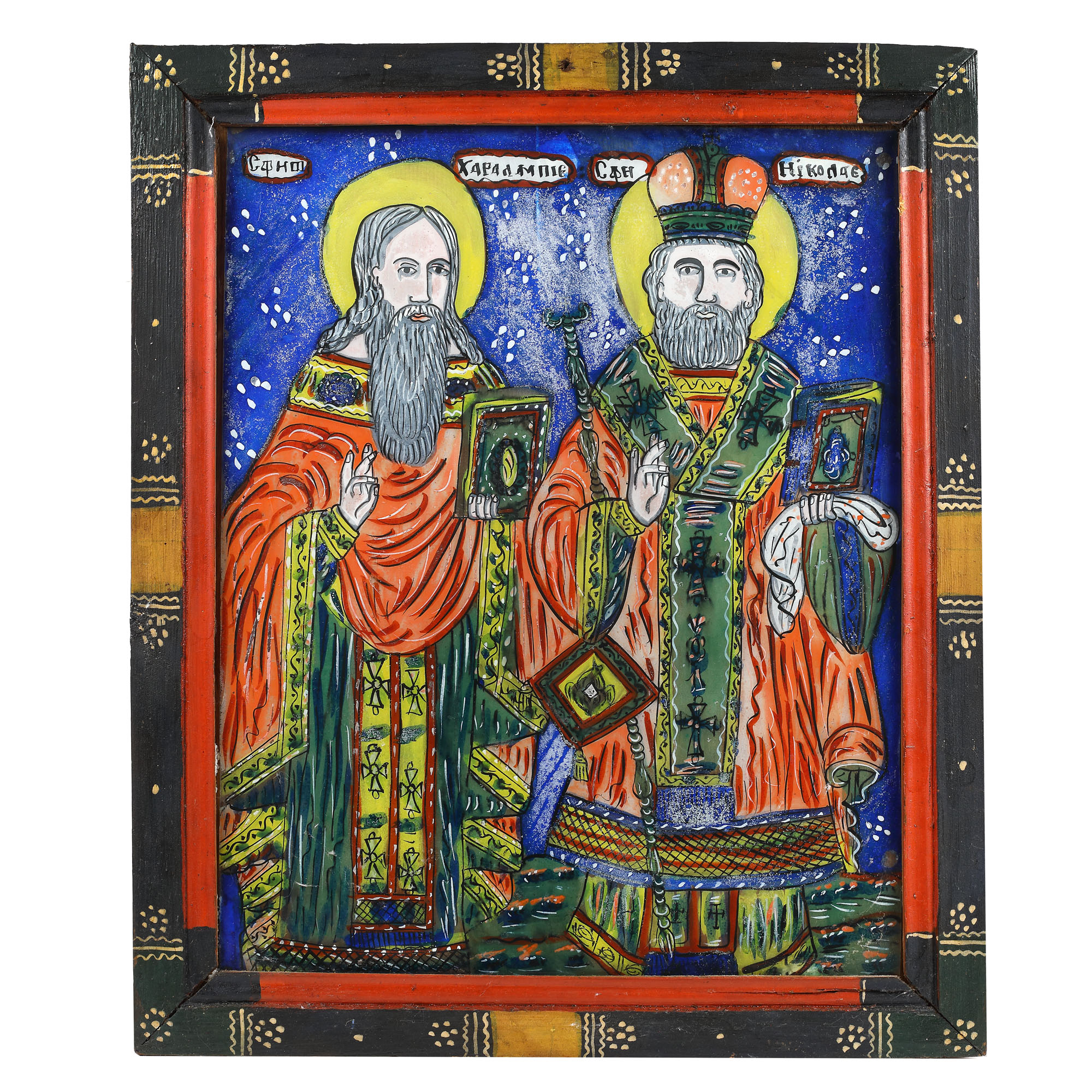 77. Icoană pe glajă, ”Sfinții Ierarhi Haralambie și Nicolae”, ramă pictată, atribuit zugrav Nicolae Oancea din Vale, Mărginimea Sibiului, deceniile de mijloc sec. XIX, de colecție