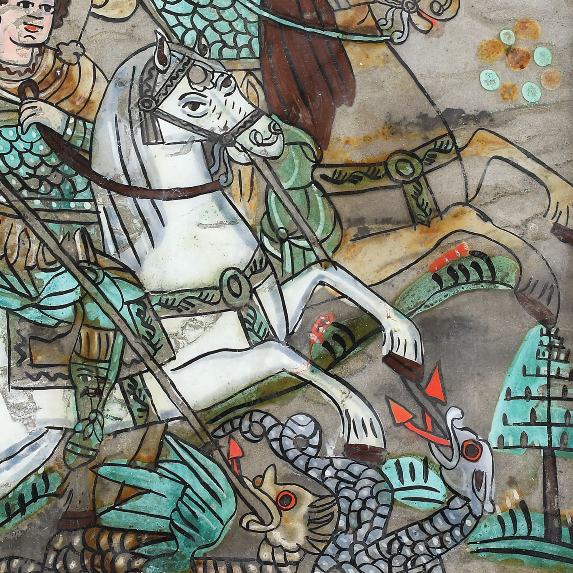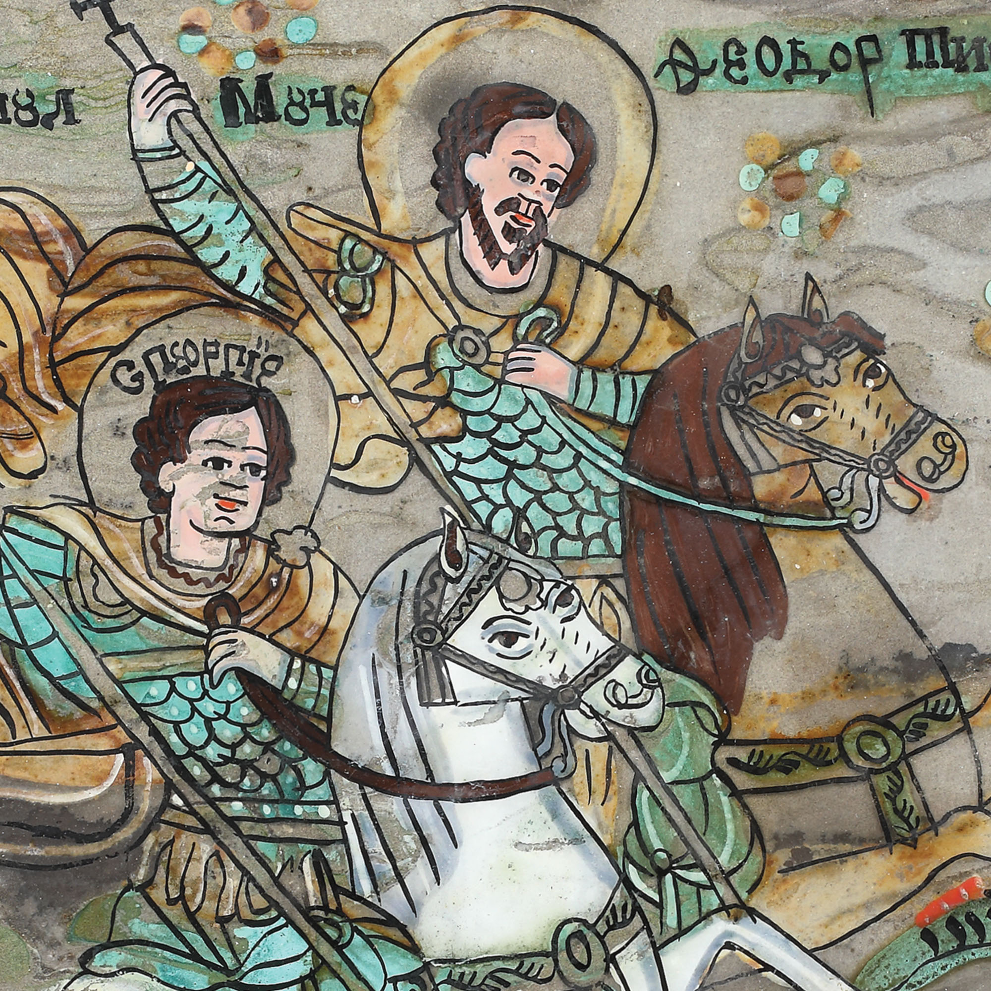 122. Icoană pe glajă, ”Sfinții Militari Gheorghe și Teodor Tiron”, atelier din Mărginimea Sibiului, deceniile de mijloc ale sec. XIX