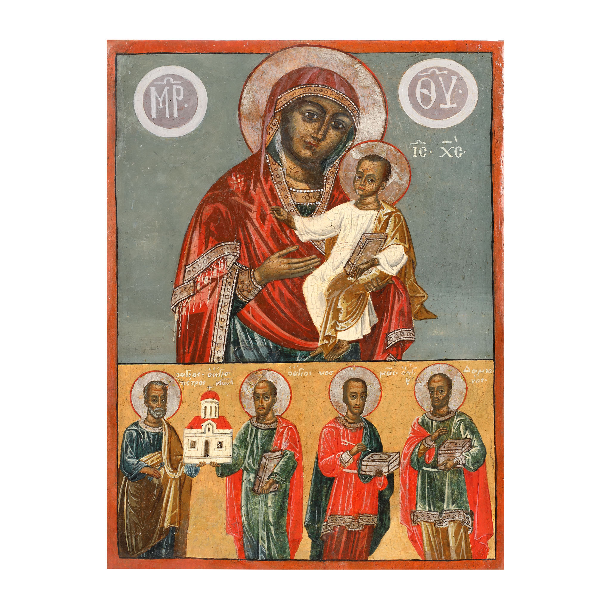 132. Icoană pe lemn, în două registre, ”Maica Domnului cu Pruncul (Hodighitria), Sfinții Apostoli Petru și Pavel și Sfinţii Doctori fără de arginţi Cosma şi Damian”, școală grecească, prima jumătate a sec. XIX