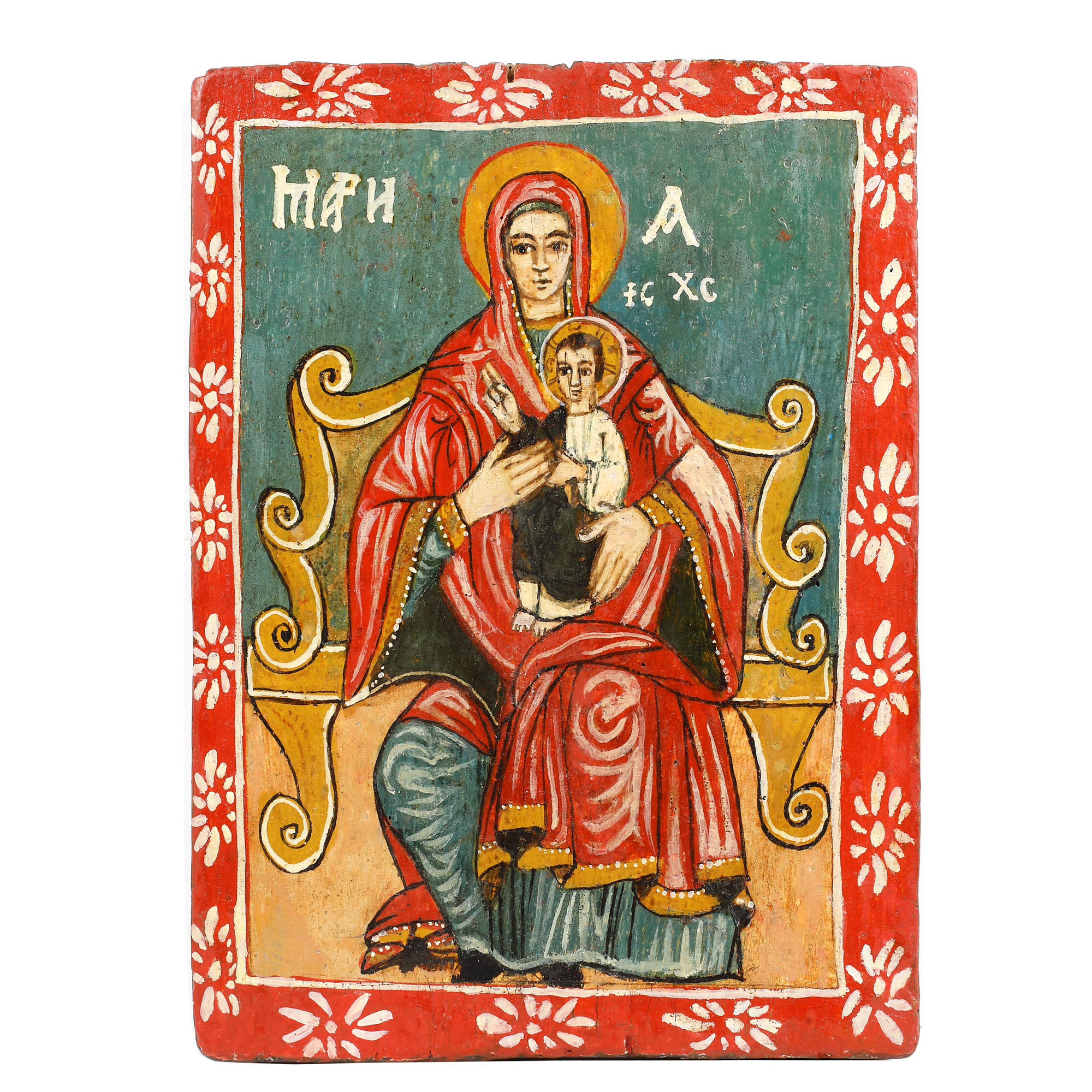 151. Icoană pe lemn, ”Maica Domnului cu Pruncul tronând”, școală românească, sec. XIX