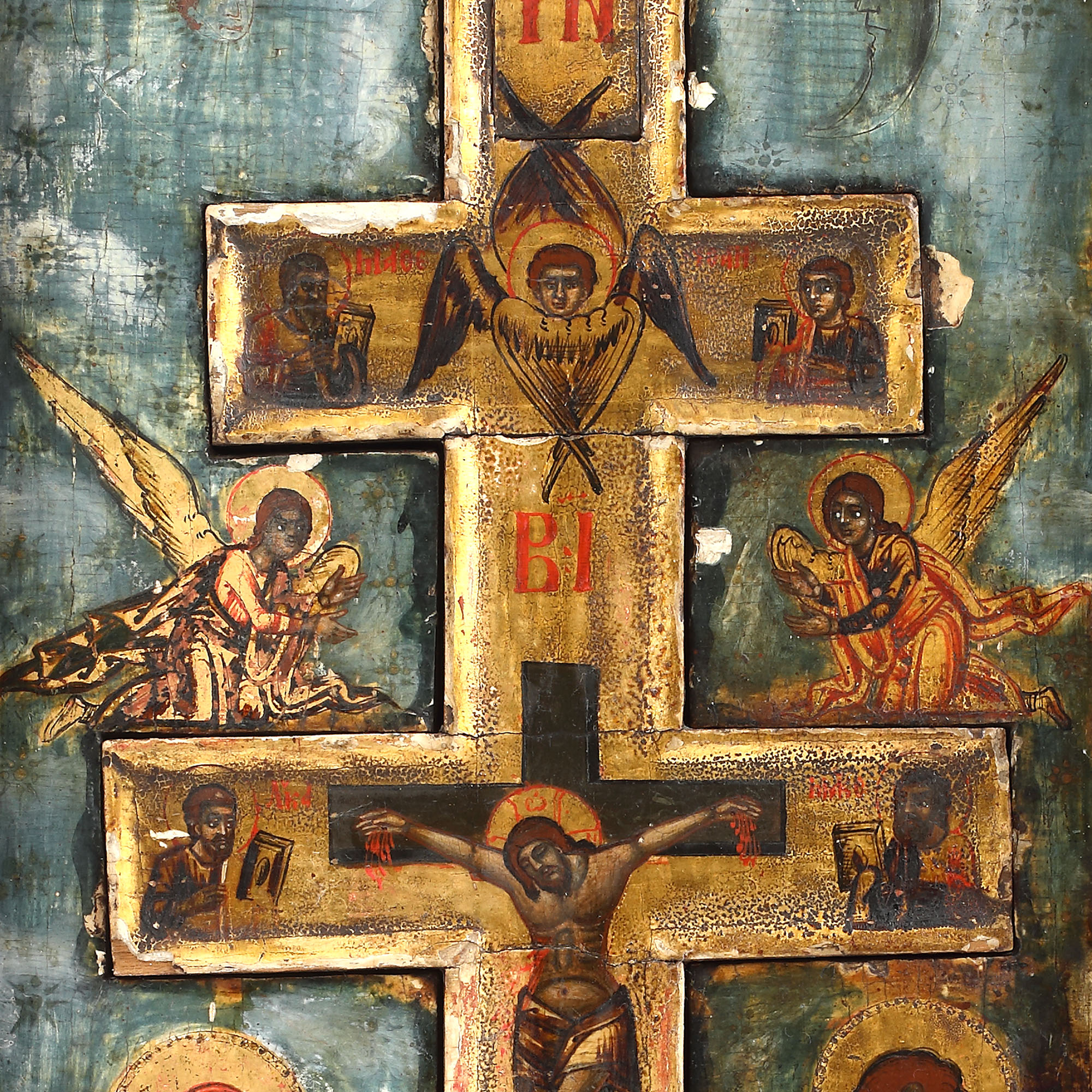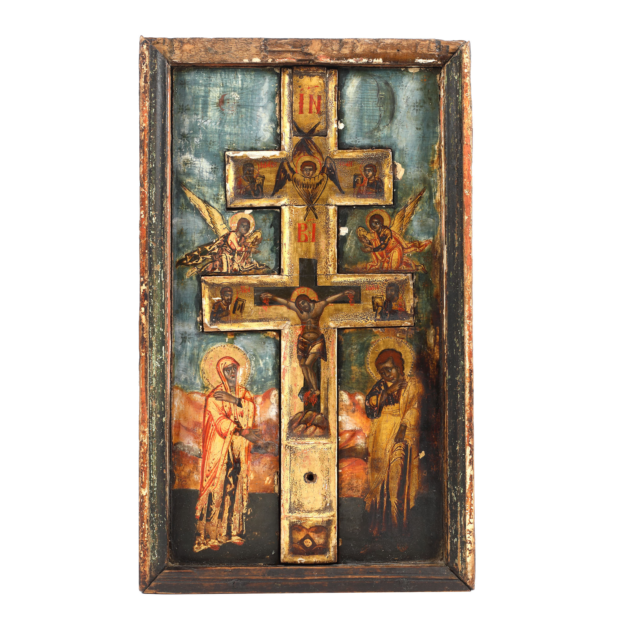 73. Icoană pe lemn, ”Răstignirea Domnului”, școală sud-dunăreană de influență grecească, sec. XVIII, piesă rară, de colecție