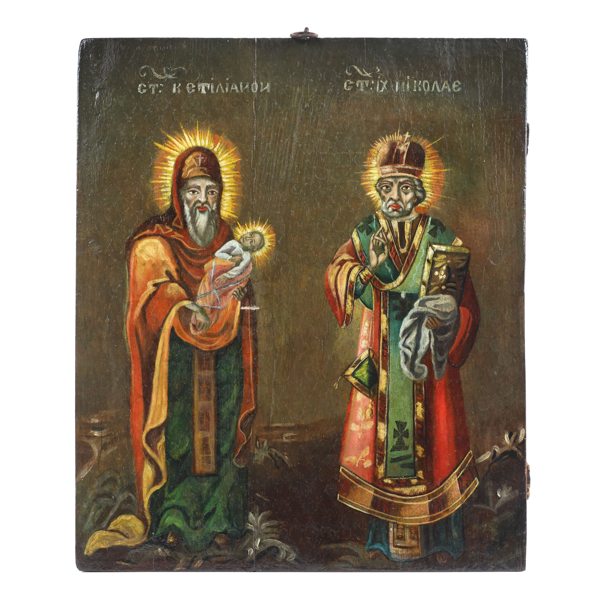 72. Icoană pe lemn, ”Sfântul Stelian și Sfântul Nicolae”, școală moldovenească, prima jumătate a sec. XIX, piesă rară