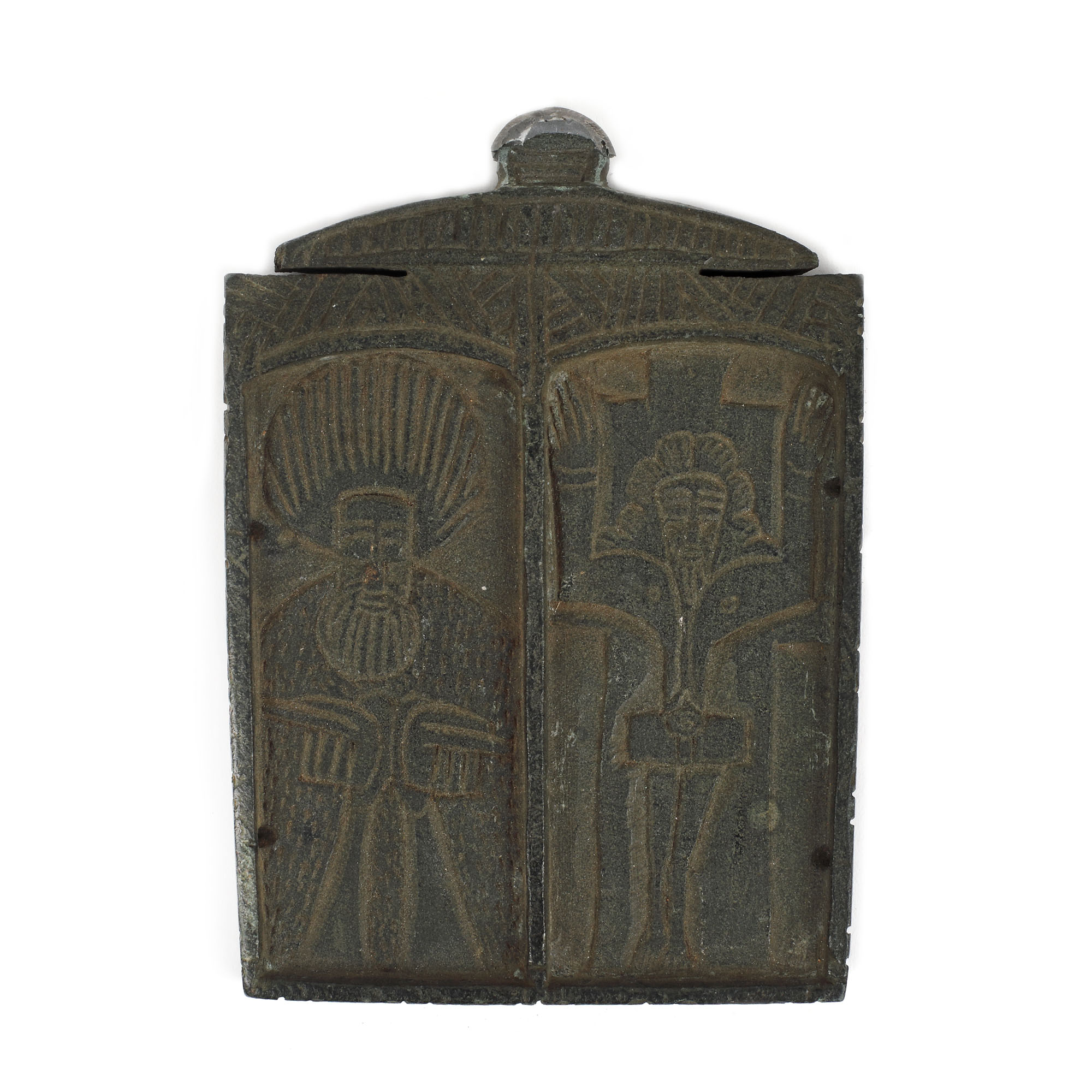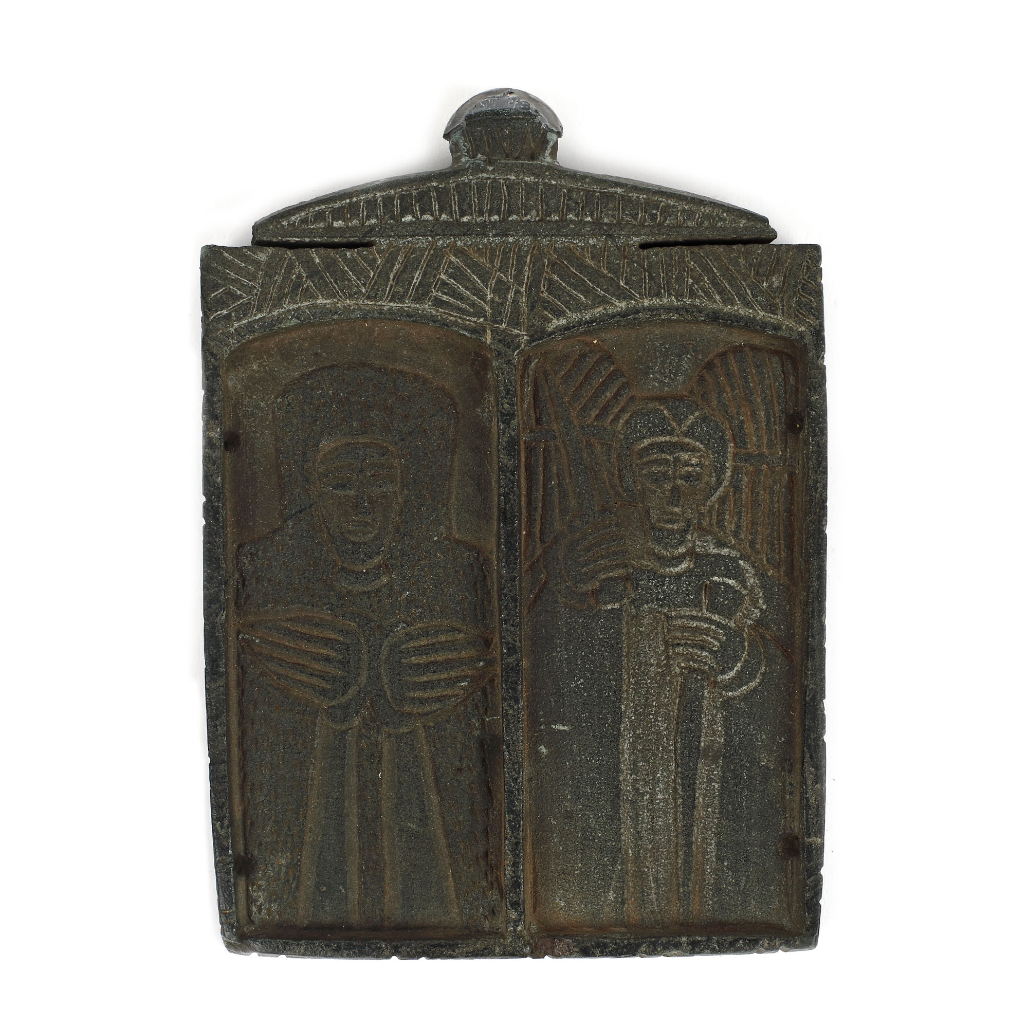 58. Iconiță dublă, din piatră, sculptată cu ”Sfântul Arhanghel Mihail și probabil Sfânta Paraschiva” și ”Iisus Răstignit și un sfânt”, atelier sud-dunărean, sec. XIX