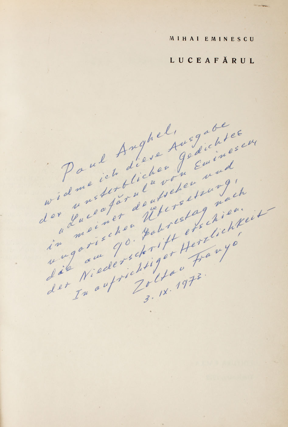 241. Mihail Eminescu, "Luceafărul", ediție trilingvă, în română, germană și maghiară, 1972. Exemplarul poartă dedicația traducătorului către Paul Anghel