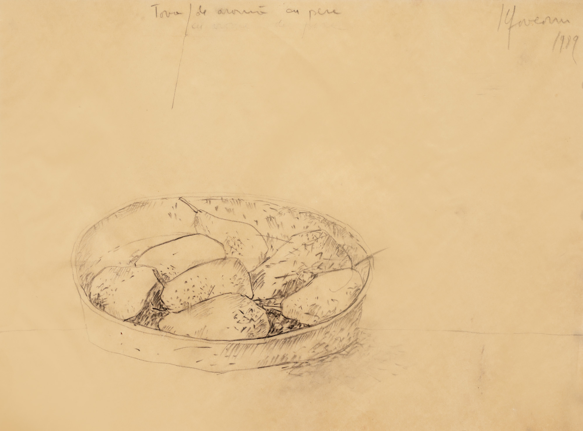 semnat și datat dreapta sus, în creion, "Ilfoveanu, 1989"; intitulat central sus, în creion, ”Tava de aramă cu pere”