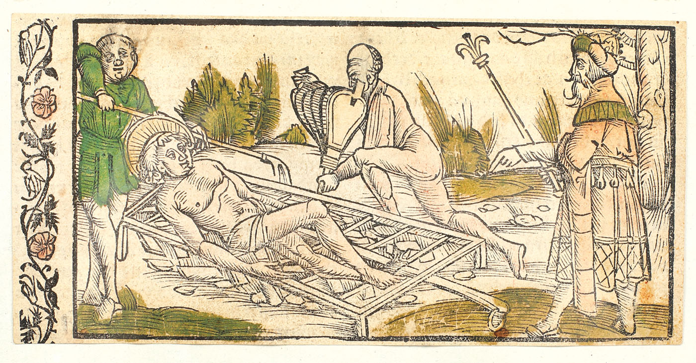 79. Litografie ilustrând patimile Sfântului Laurențiu, extrasă din volumul ”Legenda de aur”, de Jacques de Voragine, una dintre cărțile de succes ale Evului Mediu creștin, Strasbourg, 1489, provine din colecţia Lucrezia și Ion Pacea