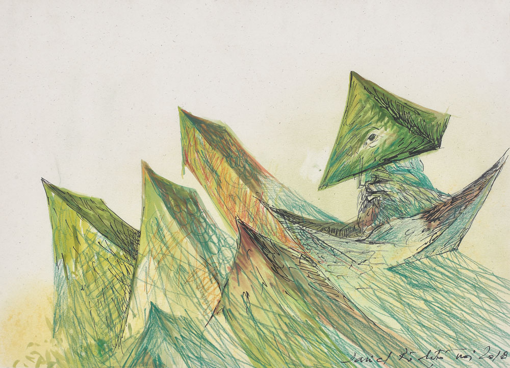 acuarelă, tuş şi creioane colorate pe carton