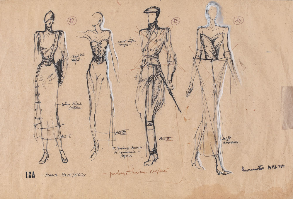 43. Schiță de costum pentru personajul actriței Ioana Pavelescu, spectacolul „Ivona, principesa Burgundiei”, de Witold Gombrowicz, regia Cătălina Buzoianu, Teatrul Mic, Bucureşti, provine din colecția artistei [1983]