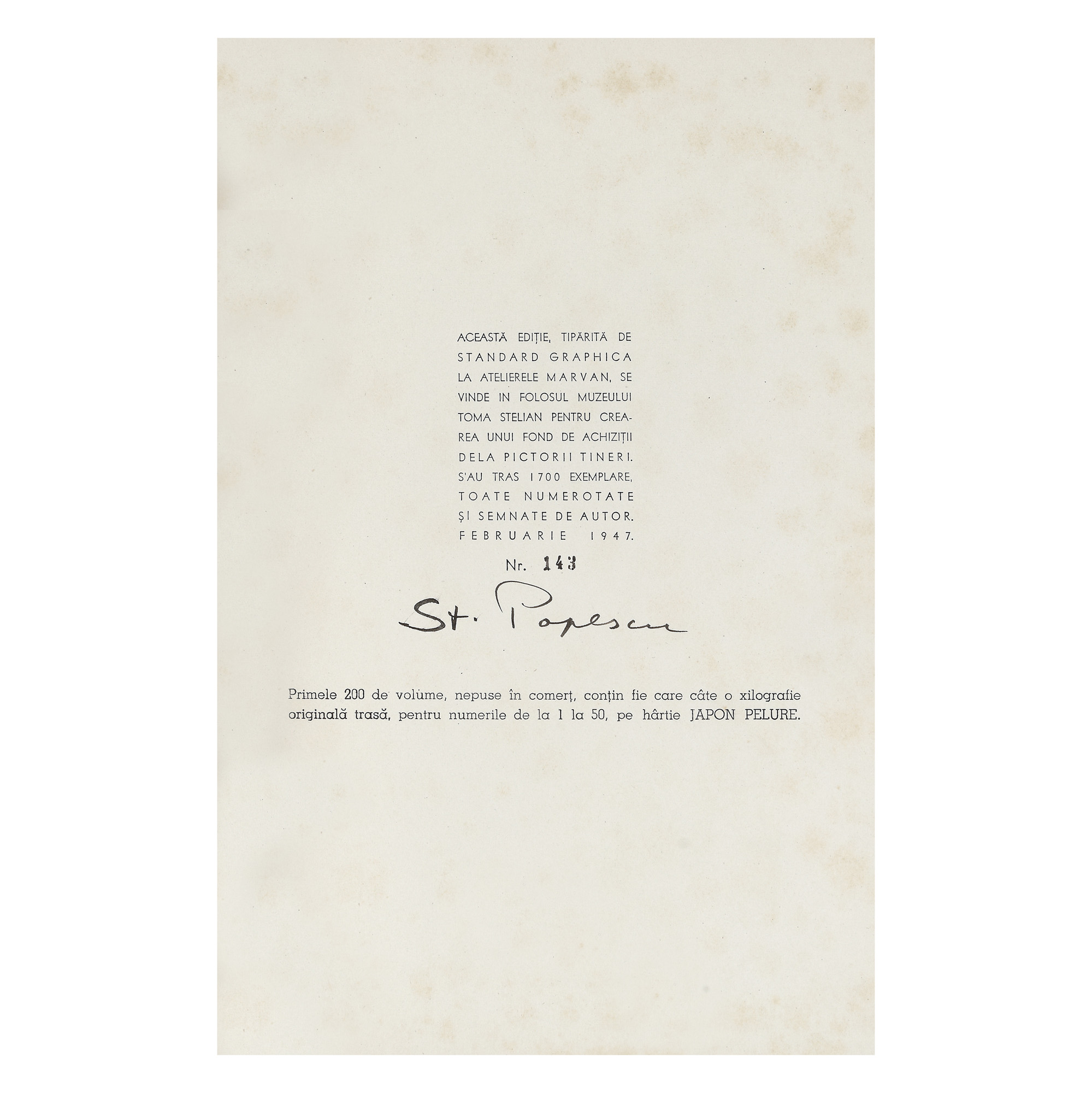 140. Album ”Ștefan Popescu”, București, 1947, cu o xilogravură originală și dedicația autorului către Alexandru Bunescu