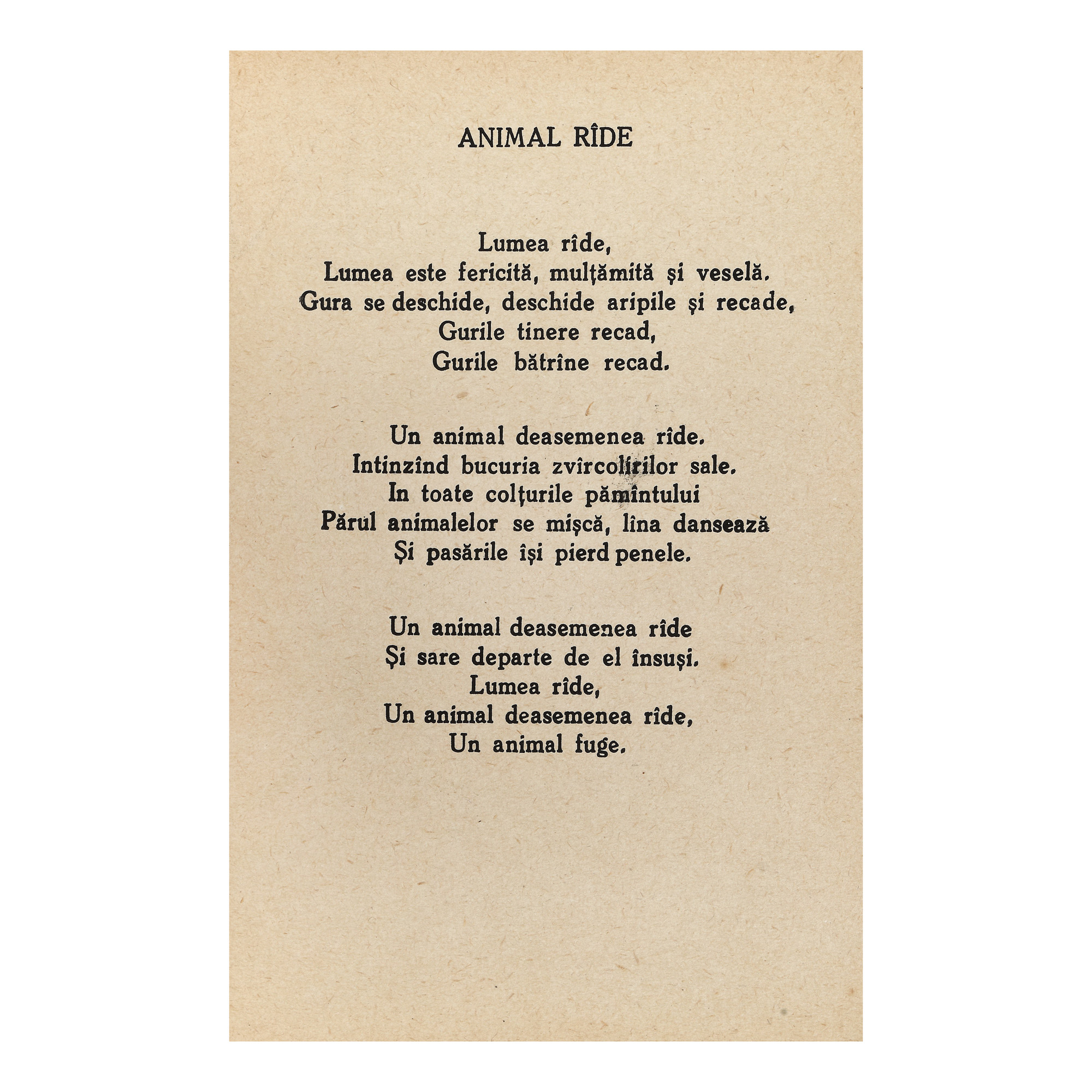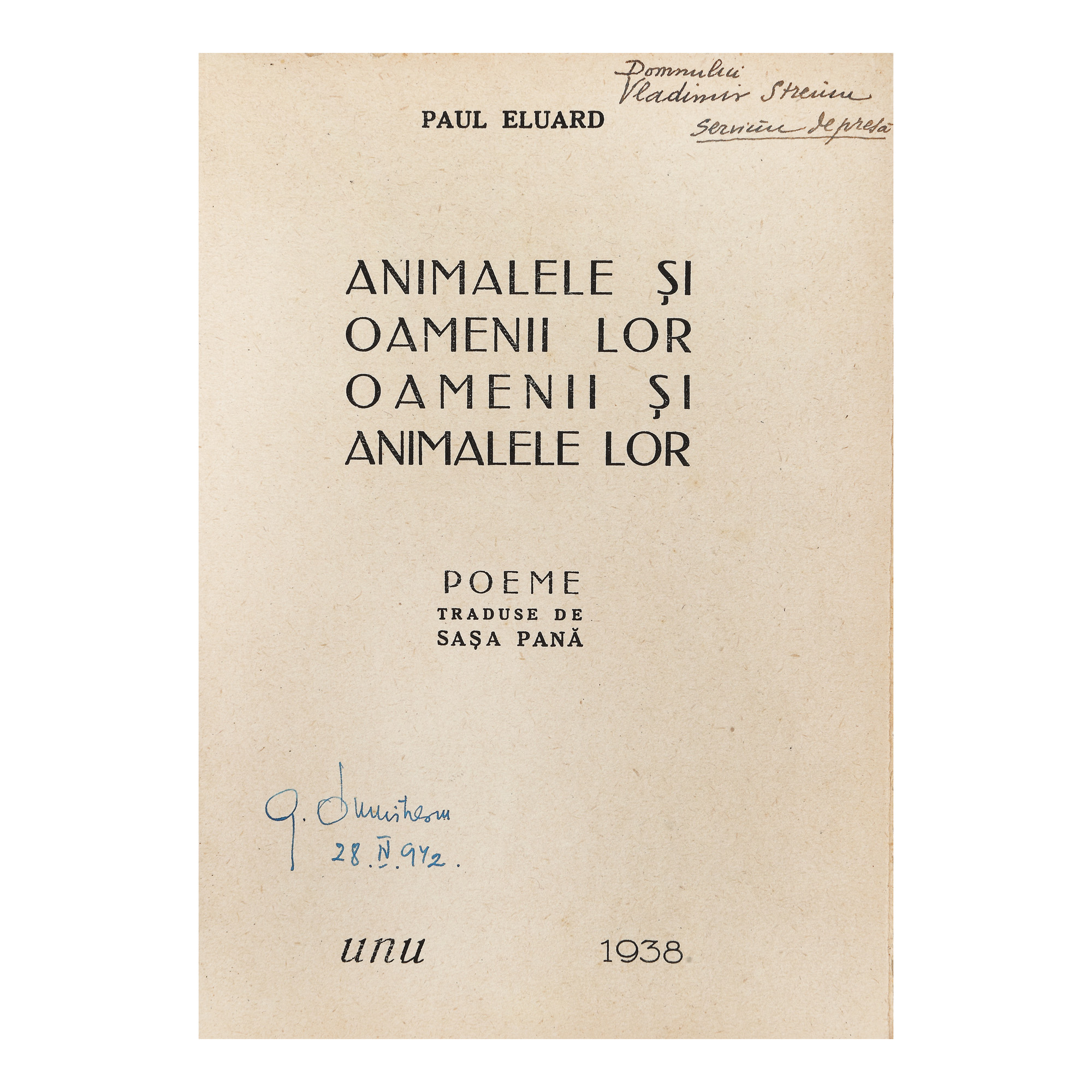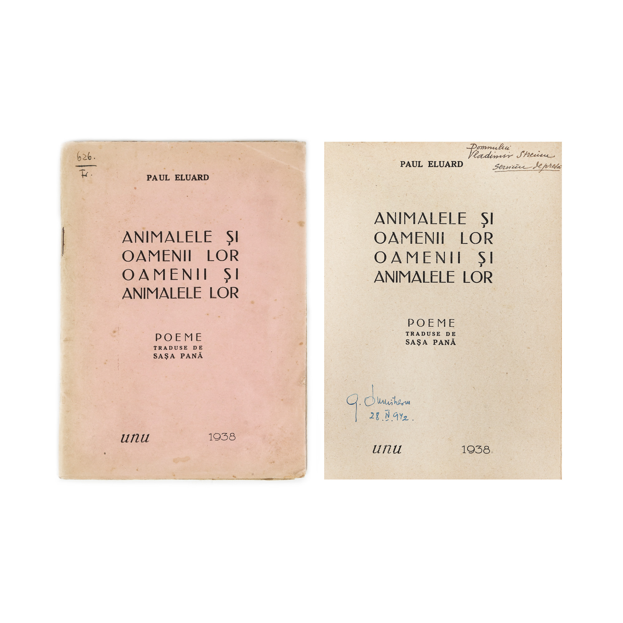148. ”Animalele și oamenii lor, oamenii și animalele lor”, de Paul Eluard, tradusă de Sașa Pană, București, 1938, cu ex-libris manuscris Geo Dumitrescu, provine din colecția Vladimir Streinu