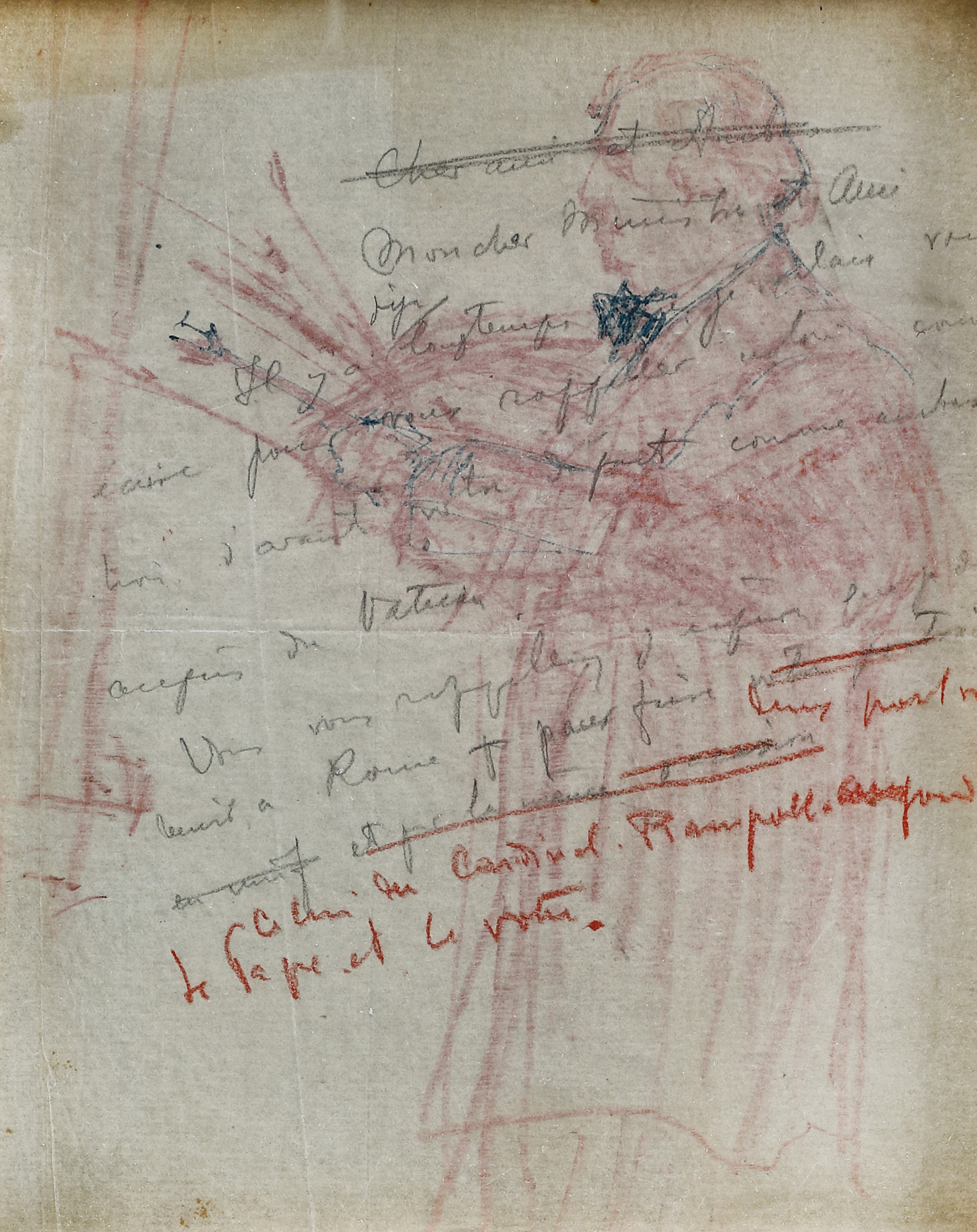 notat pe verso, în creion: "Mon cher ministre et ami, Il y a deja longue temps que je voulais vous ecrire pour vous rappleer notre conversation d'avant votre depart comme ambassadeur de Vatican. Vous vous rappelez que je vais aller a Rome pour faire deux portraites, celui de Cardinal Rampoll et le votre"