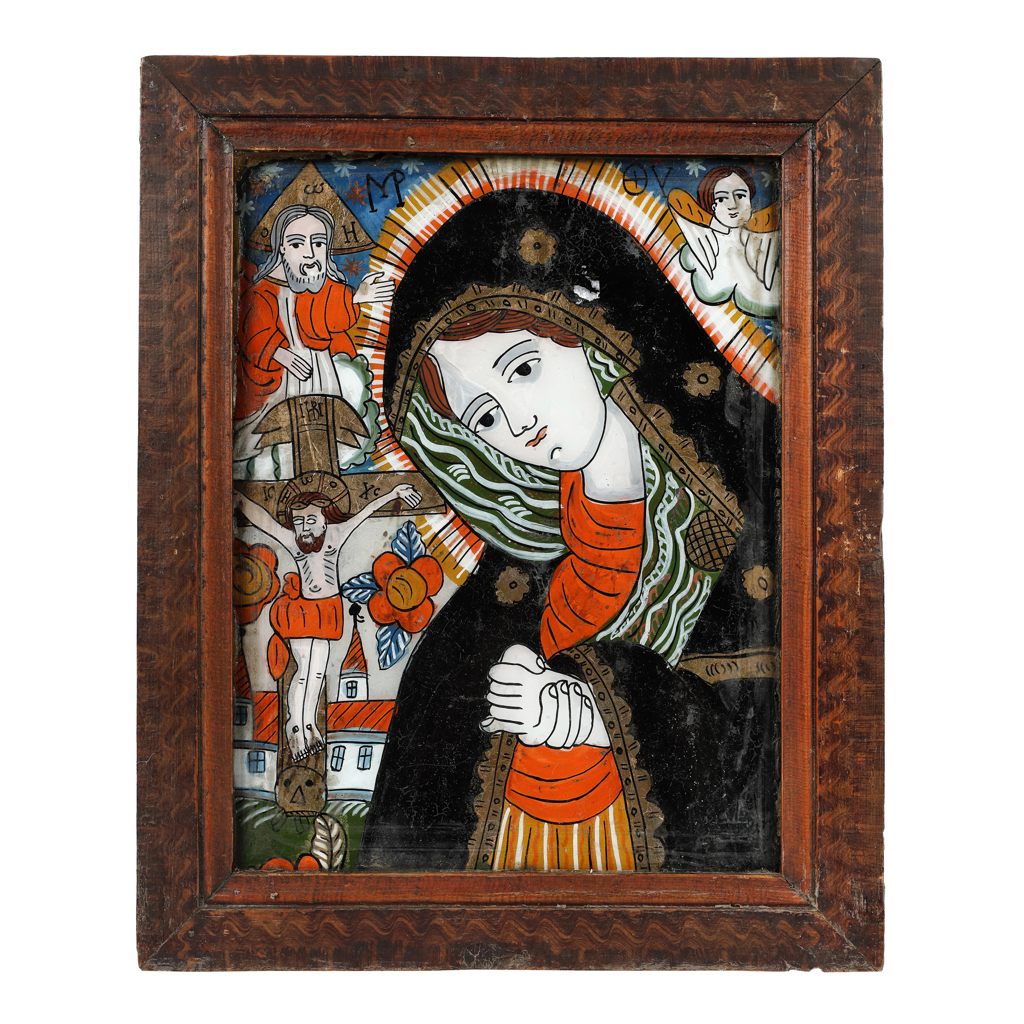 106. Icoană pe glajă, ”Maica Domnului Îndurerată”, ramă pictată, atelier transilvănean (Șcheii Brașovului), a doua jumătate a sec. XIX