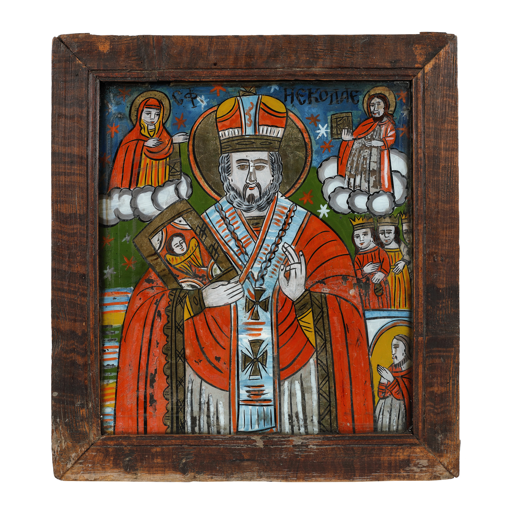 108. Icoană pe sticlă, ”Sfântul Nicolae”, ramă pictată, atelier transilvănean (Șcheii Brașovului), prima jumătate a sec. XIX