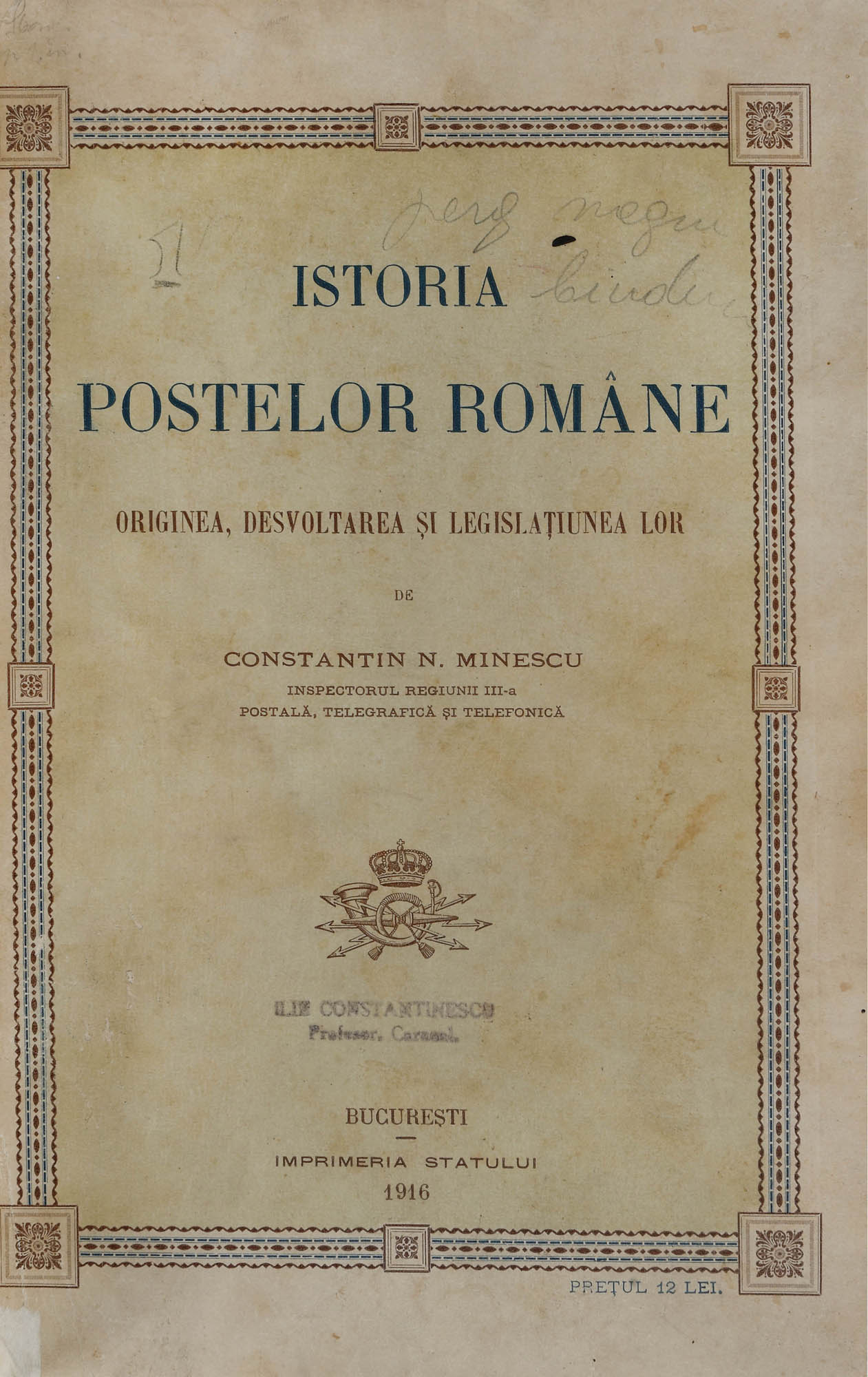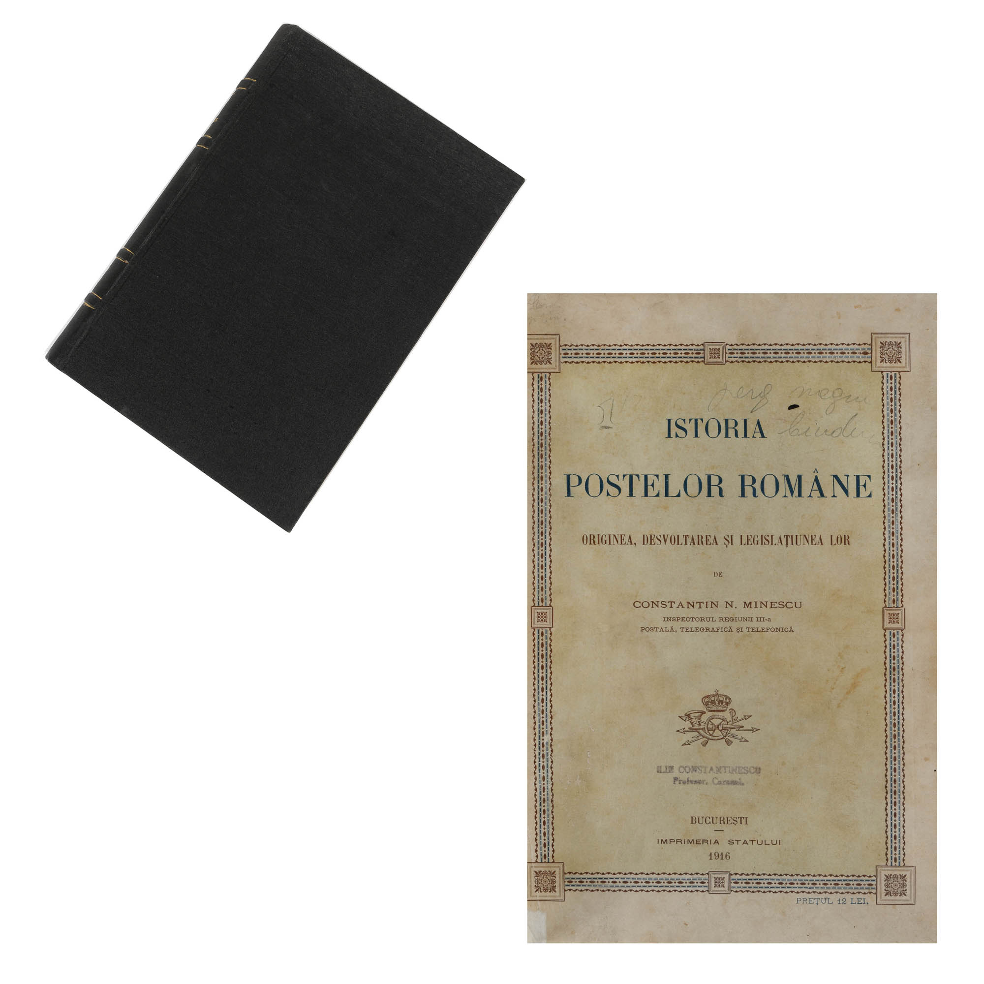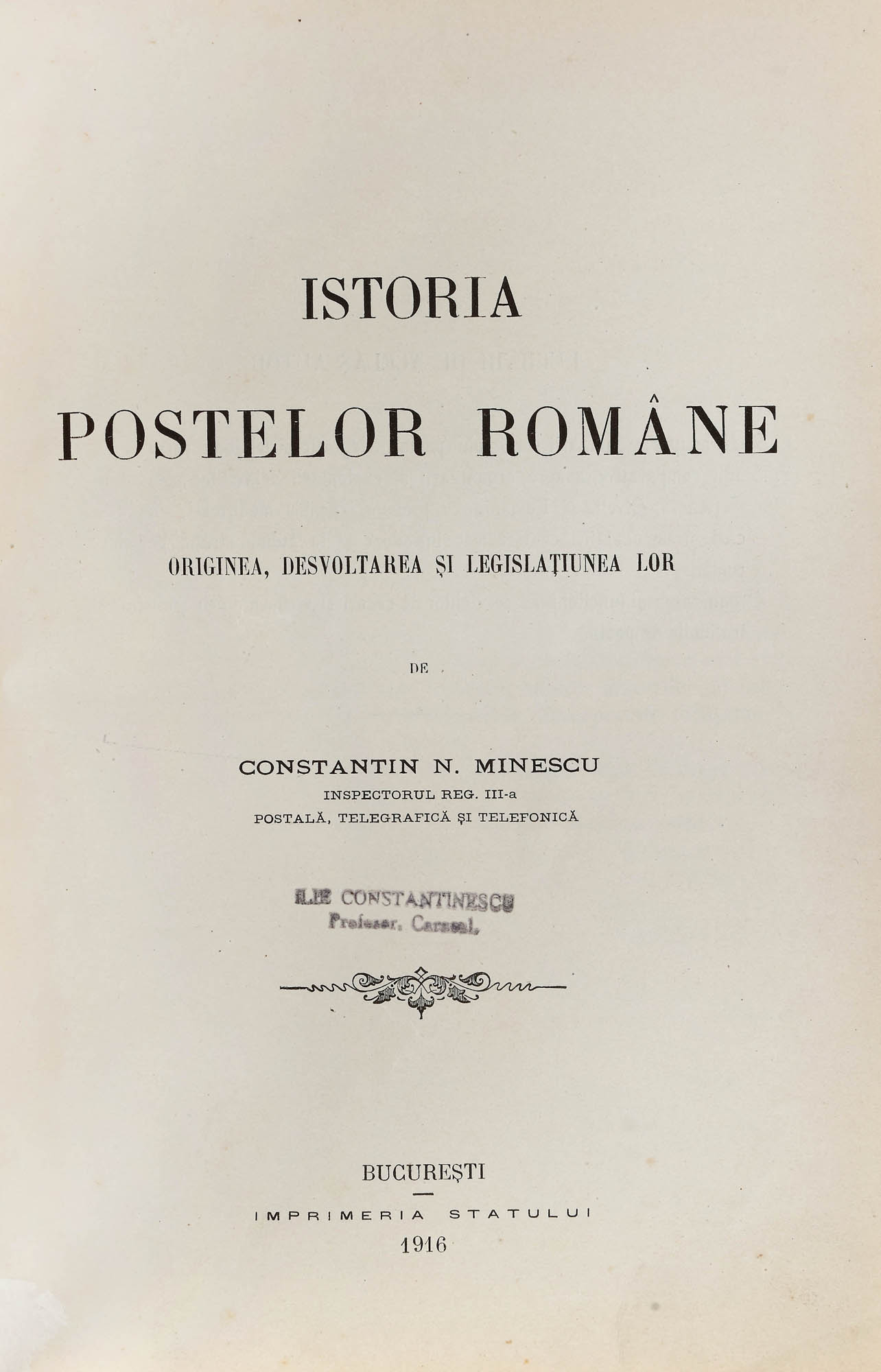 176. ”Istoria poștelor române”, de Constantin N. Minescu, București, 1916, cu ex-libris Ilie Constantinescu