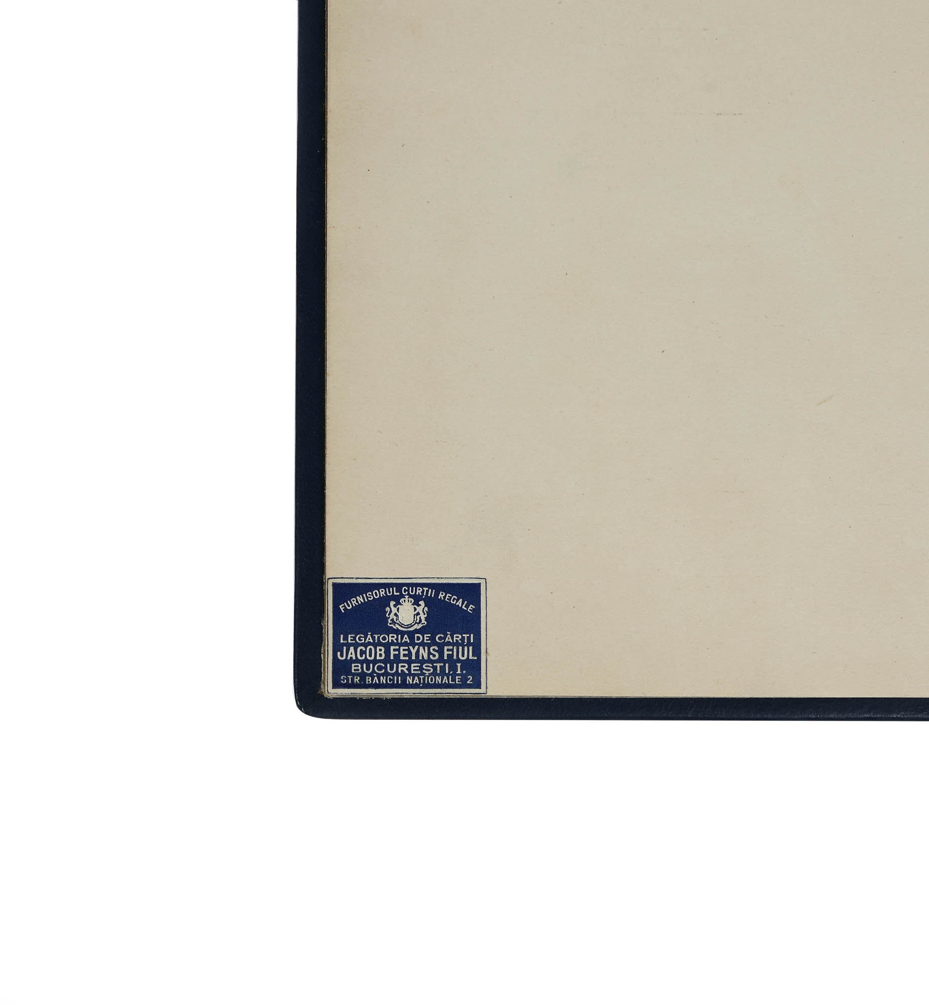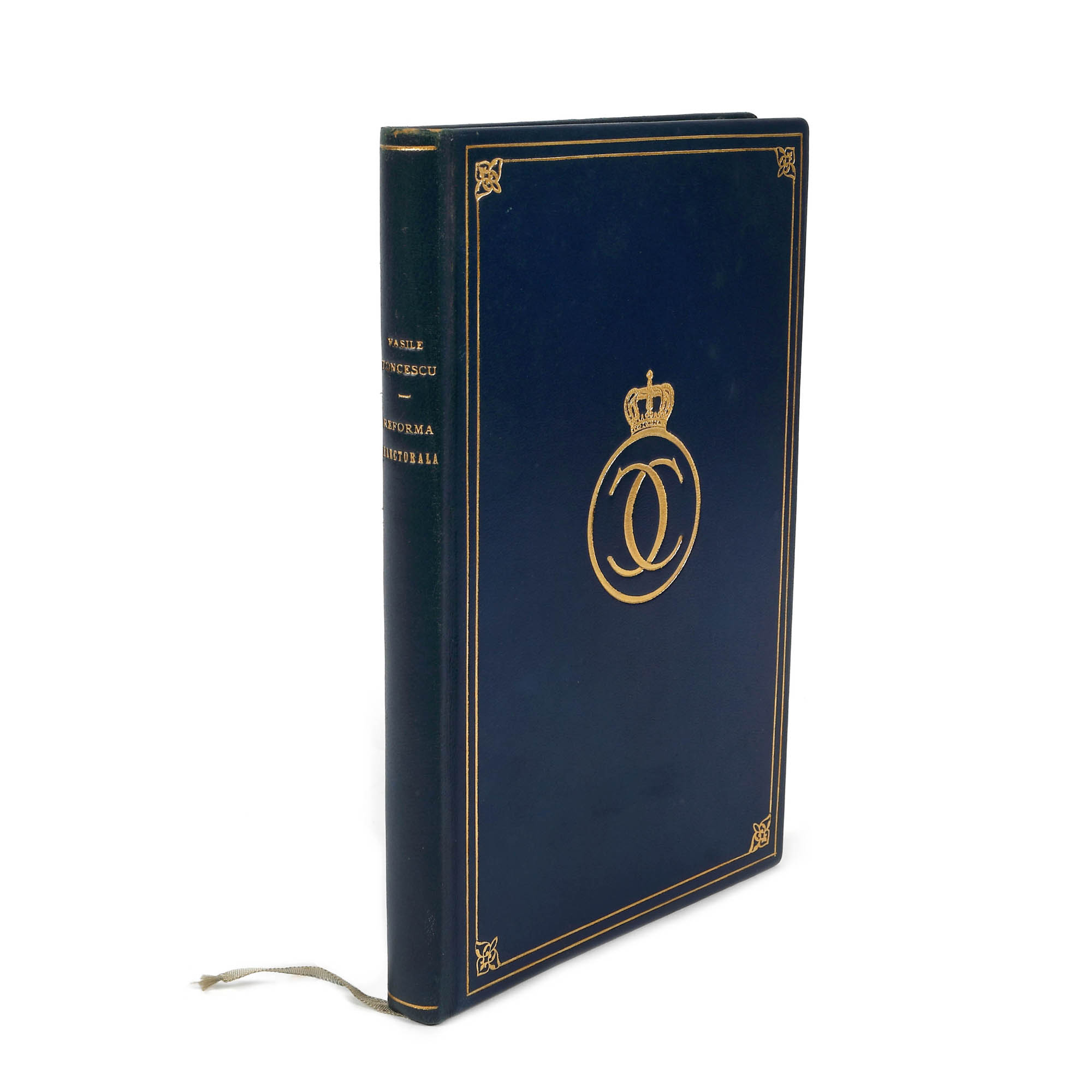 Legatura din piele albastră pe carton, decorată cu auriu și efigia regelui Carol al II-lea realizată în legătoria ”Jacob Feyns fiul”, Furnizorul Curții Regale.