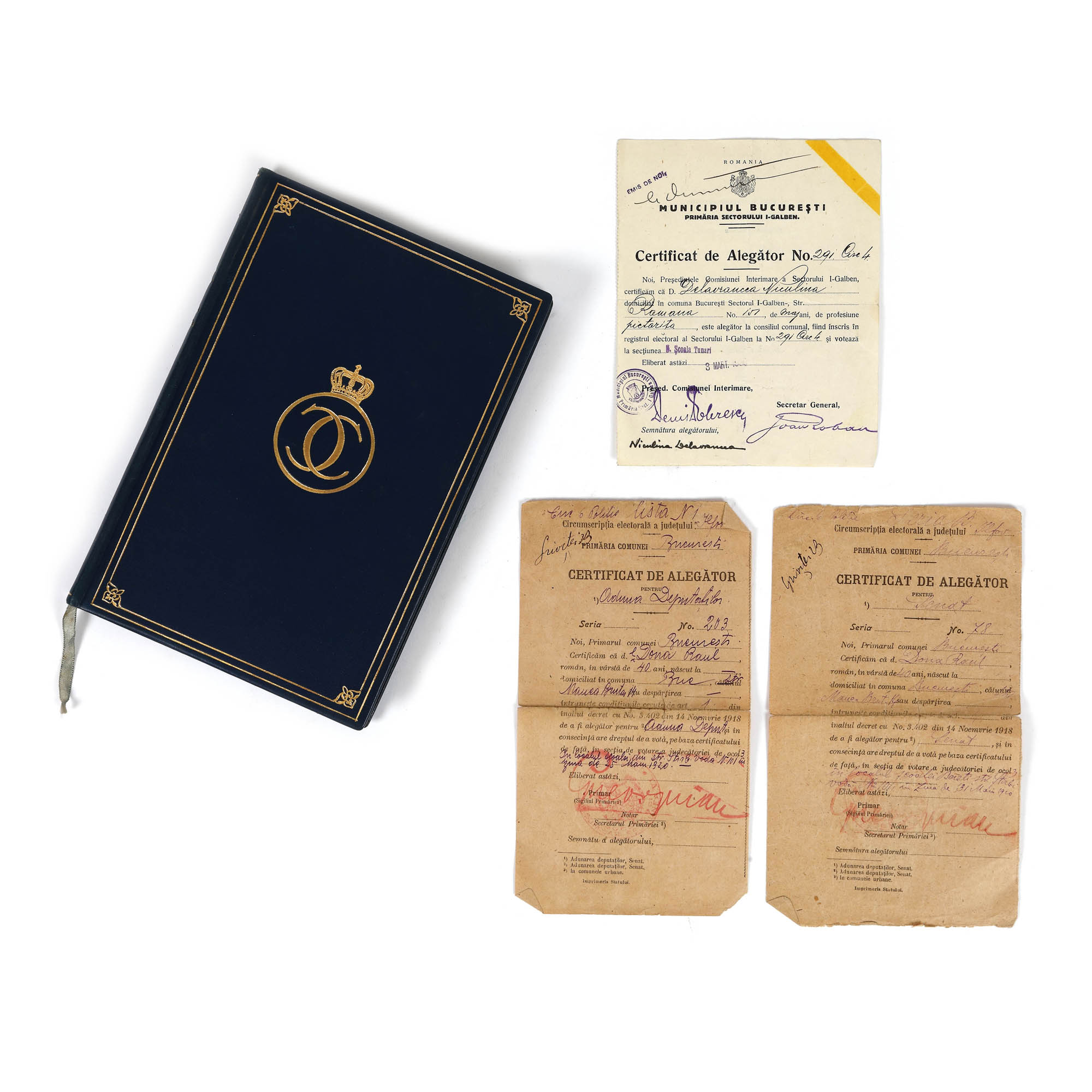 183. Lot format din ”Reforma electorală”, de Vasile Toncescu, București, 1932, cu etui, două certificate de alegător pe numele Dona Raul, 1920, și un certificat de alegător pe numele Niculina Delavrancea, 1930, cu semnătura olografă a Niculinei Delavrancea