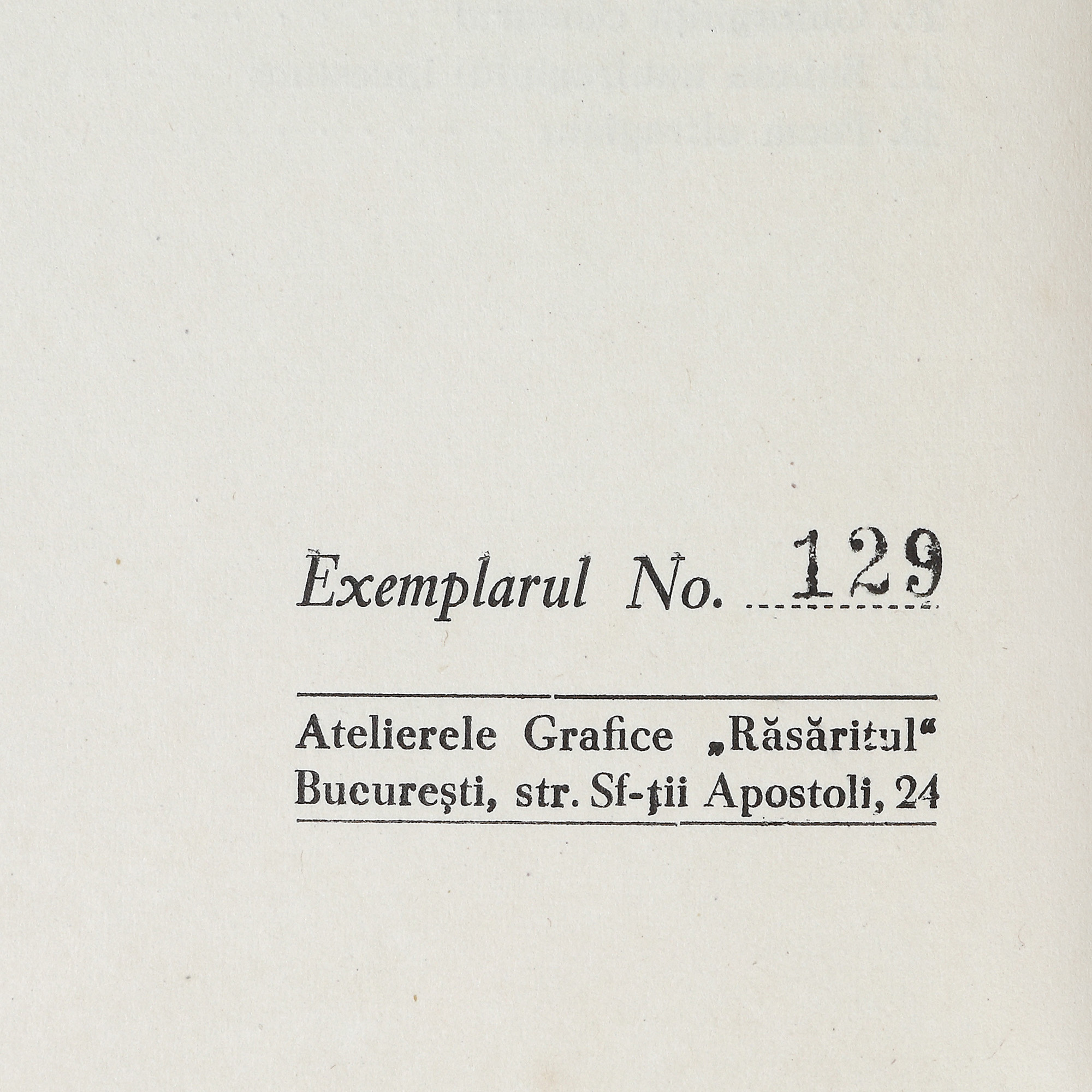 Exemplat numerotat 129 din 250, pe hârtie velină omnia. Volumul conține amprentele digitale ale autorului.