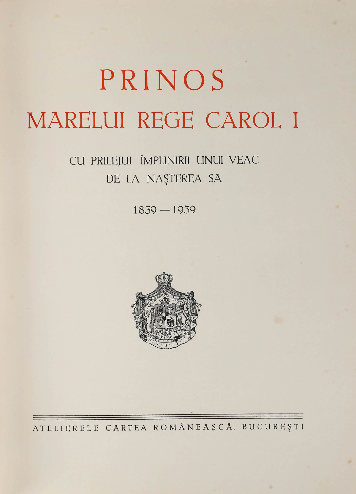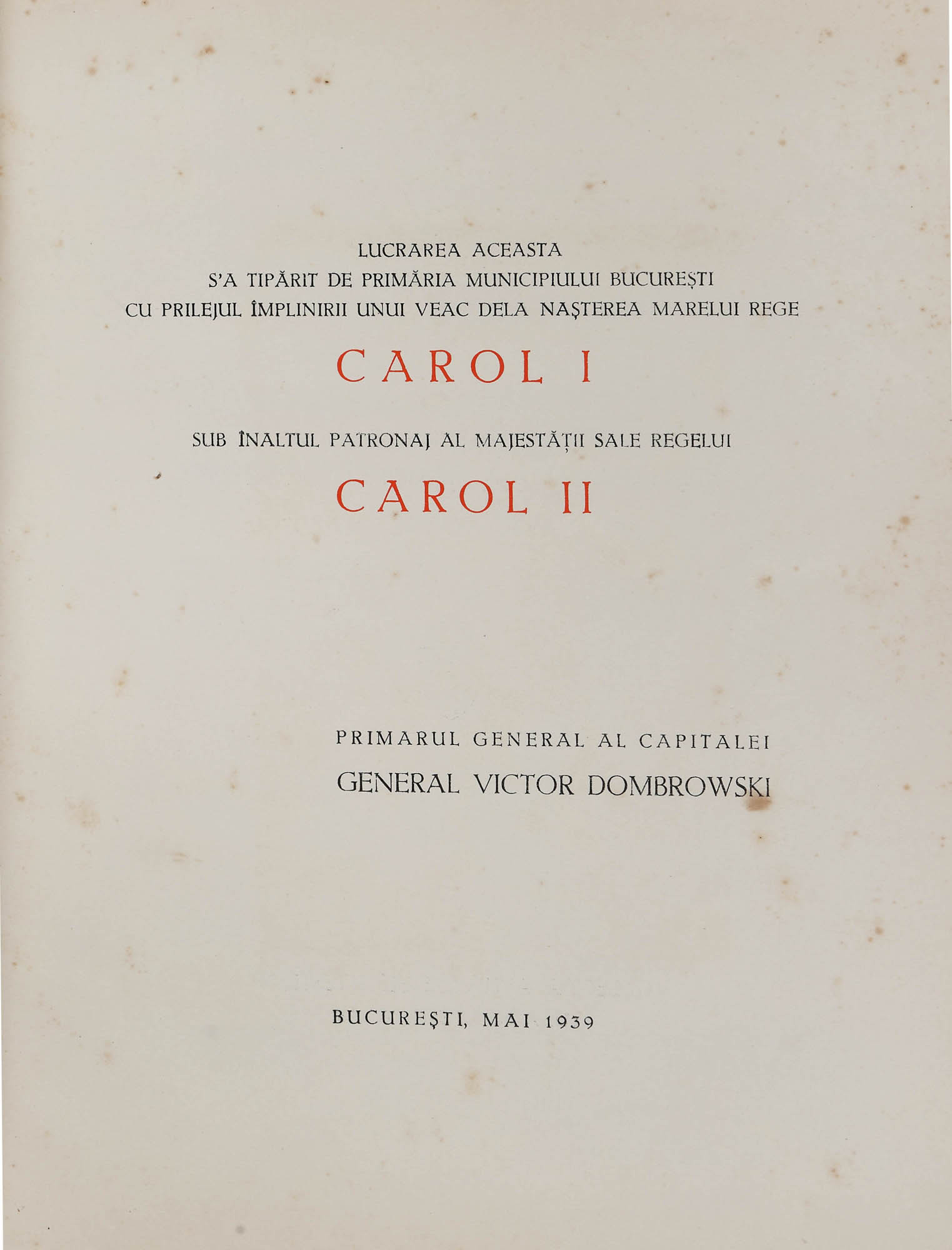 172. “Prinos Marelui Rege Carol I”, tipărită din ordinul Generalului Victor Dombrovski, primar al Bucureştiului, cu ocazia împlinirii unui veac de la naşterea M.S. Regelui Carol I, Bucureşti, 1939