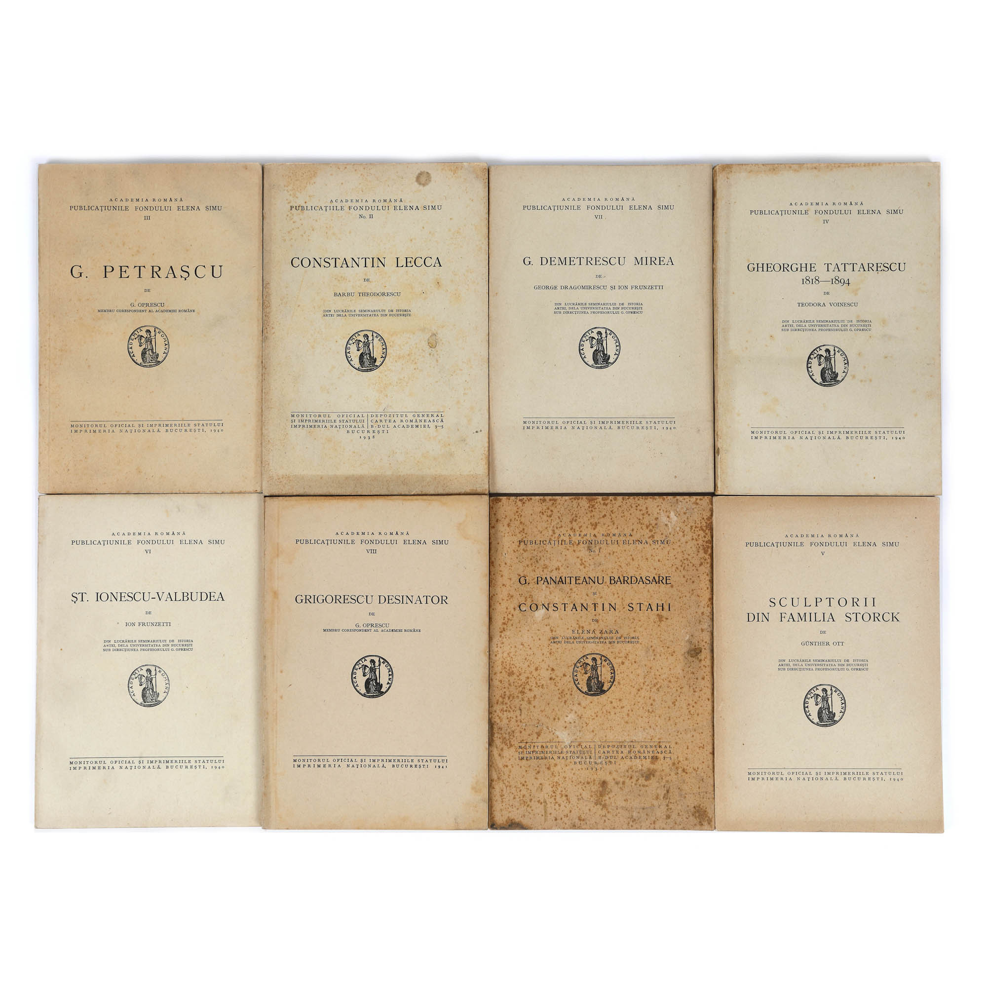 135. Seria completă a monografiilor din seria Elena Simu, formată din nouă vechi albume de artă interbelice: ”G. Petrașcu”, de George Oprescu, București, 1940; ”Constantin Lecca”, de Barbu Theodorescu, București, 1938; ”G. Demetrescu Mirea”, de George Dragomirescu și Ion Frunzetti, București, 1945; ”Gheorghe Tattarescu”, de Teodora Voinescu, București, 1940; ”Șt. Ionescu-Valbudea”, de Ion Frunzetti, București, 1940; ”Grigorescu desinator”, de George Oprescu, București, 1941; ”Sculptorii din familia Stork”, de Gunther Ott, București, 1940, și ”G. Panaiteanu Bardasare și Constantin Stahi”, de Elena Zara, București, 1937