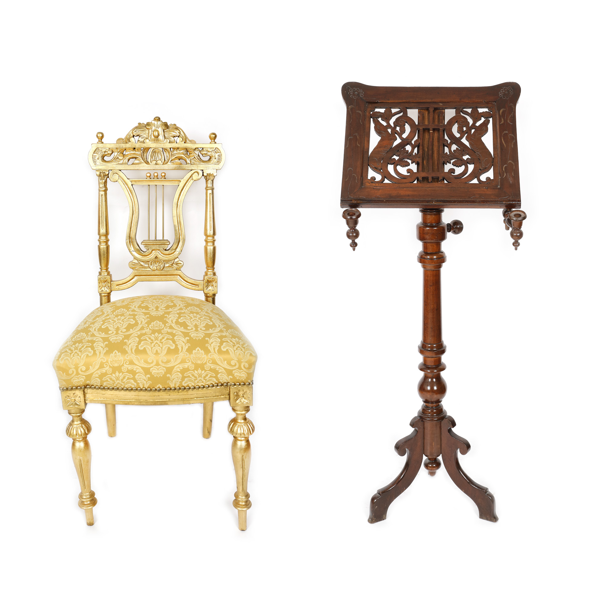 102. Stativ pentru partituri și scaun cu spătar în formă de liră, începutul sec. XX, au aparținut pictorului Eustațiu Stoenescu