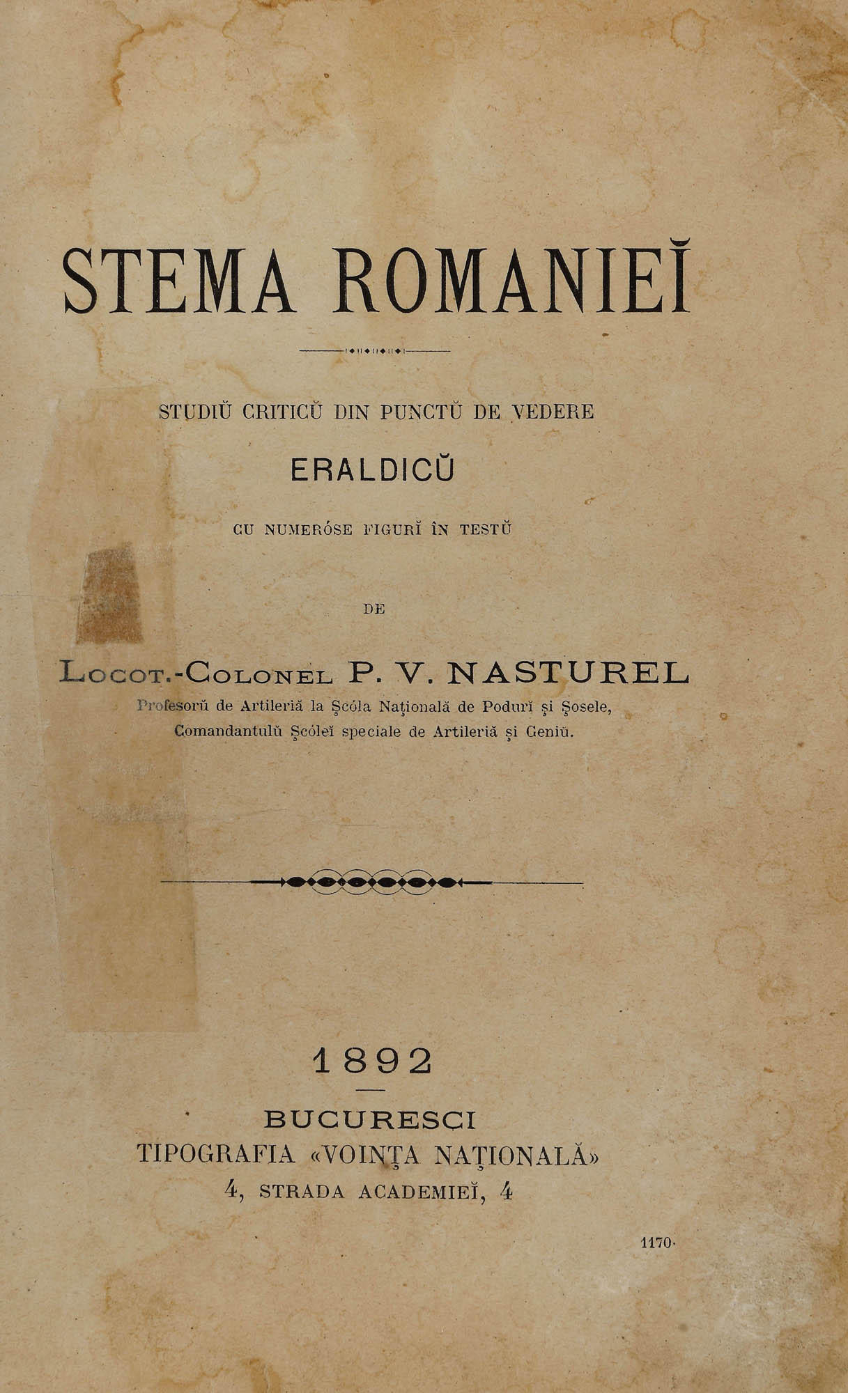170. "Stema României", de lt.col. Petre Vasiliu-Năsturel, Bucureşti, 1892