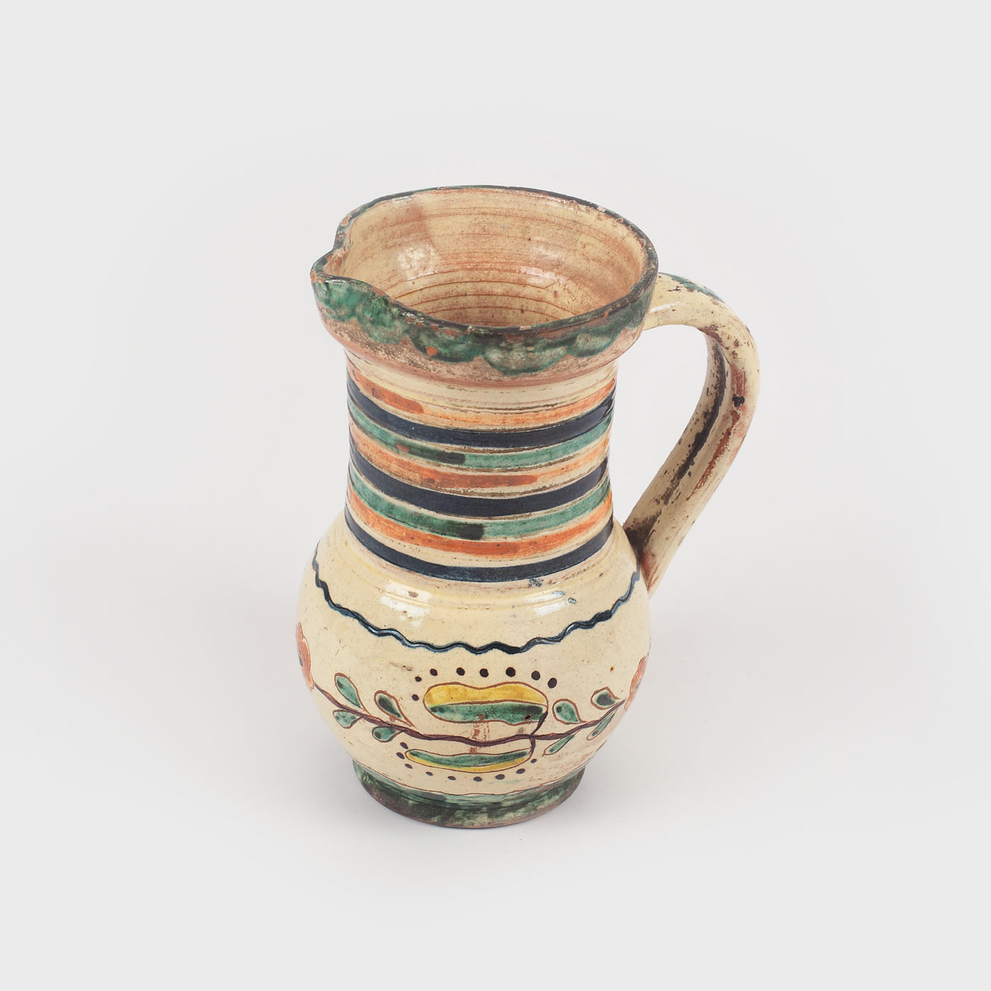 Cană de Maramureș, primul pătrar al sec. XX , decorat pe fond angobat cu motive vegetal-florale stilizate și geometrice cu grupaje de dungi pe gât și semicercuri pe buză și motive vegetale pe burtă.