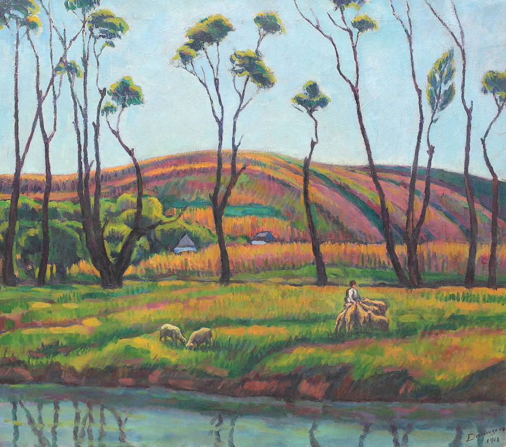 În decembrie 1911 creația lui Nicolae Dărăscu intra în vizorul criticii de artă românești, când tânărul debuta cu o expoziție personală pe simezele Ateneului Român. Expoziția, concentrată în cele 42 de peisaje aduse din Franța, oferea practic creația picturală a ultimilor 3 ani petrecuți de Dărăscu în Paris și sudul Franței. În 1908 acesta descoperea portul Saint-Tropez, urmând pașii neoimpresioniștilor ce băteau coastele sudice și estice ale Mediteranei. Disciplina pointilistă, preluată mai mult ca teorie a unei maniere noi de pictare decât ca practicarea unei arte senzoriale, s-a dovedit cea necesară modelării stilului postimpresionist de mai târziu. Dacă lecția lui Signac s-a dovedit prea îngrăditoare pentru caracterul și stilul lui Dărăscu, acesta și-a eliberat treptat maniera și sub influența lui Matisse și a nevoii sale de expresie. Astfel, pe parcursul perioadei petrecute în golfurile din preajma Saint-Tropez-ului sau a Grimaud-ului, între 1908 și 1913/1914, compoziția dărăsciană a progresat, tușă cu tușă, spre o creație postimpresionistă a unui colorist desăvârșit. Prin voluptatea picturii în stil (neo)impresionist, coordonată și de atracția pentru mediul acvatic și caracterizată de divizionismul cromatic, Dărăscu se prezenta în 1911 în fața unui public în mare parte neavizat. Chiar dacă nu a suscitat cele mai profunde reacții de susținere din partea criticii autohtone, evenimentul punctează momentele în care Dărăscu intra în contact cu gruparea literar-artistică din jurul lui Alexandru Bogdan-Pitești, cunoscutul publicist și mecena. Tudor Arghezi, unul dintre puținii critici ce au înțeles pictura lui Dărăscu încă de la debut, avea să intermedieze contactul acestuia cu cenaclurile organizate de Bogdan-Pitești atât în București, la casa din Știrbei Vodă, dar mai ales la cel organizat drept “tabără” de creație, la conacul de la Vlaici. Dărăscu intra destul de rapid într-un cerc select al culturii românești, apropiindu-se și de cel ce “revoluționa” mediul artistic autohton alături de gazda de la Vlaici – Ștefan Luchian. Chiar dacă activitatea efectivă la conacul de la Vlaici nu va depăși verile a trei ani (1912-1915), tehnica lui Dărăscu, ce se afla încă în etapele de căutări, a fost, chiar și parțial, influențată fie de peisaj, fie de sursa tematică întâlnite acolo. Oricare ar fi concluziile despre perioada petrecută în sânul cenaclurilor, cert este că Bogdan-Pitești se îndrăgostea de creația lui Dărăscu, fapt relevat de inventarul realizat în anul desființării marii colecții (1924), când pictorul era reprezentat cu peste 60 de opere (uleiuri, acuarele, grafică). În ceea ce privește opera de față, putem lesne interpreta compoziția drept relevantă întregului ciclu de uleiuri realizat în perioada 1910-1916, în ceea ce privește etapa românească. Știut fiind faptul că această perioadă coincide și cu cel mai important prag evolutiv de la începutul carierei, când Dărăscu descoperea atât peisajul european, cât și cele mai influente curente moderniste, peisajele realizate la Vlaici devin unice în tabloul compozițiilor relevante spațiului autohton. Alături de “Peisaj românesc” (vezi catalogul Expoziției Retrospective Nicolae Dărăscu, Muzeul de Artă al R.S.R., 1966, cat. 9) sau “O vedere din Vlaici” (Muzeul de Artă Iași, inv. 1143), “Ciobănaș cu oi, la Vlaici” atinge cele mai importante caracteristici ale picturii lui Dărăscu pentru etapa românească. Tehnica binecunoscută, în care se intercalau note neoimpresioniste, alături de un parfum autentic românesc, atât prin specificitatea peisajului, dar și cea a subiectului, notează bornele estetice ale creației lui Nicolae Dărăscu pentru perioada antebelică. (I.P.)
