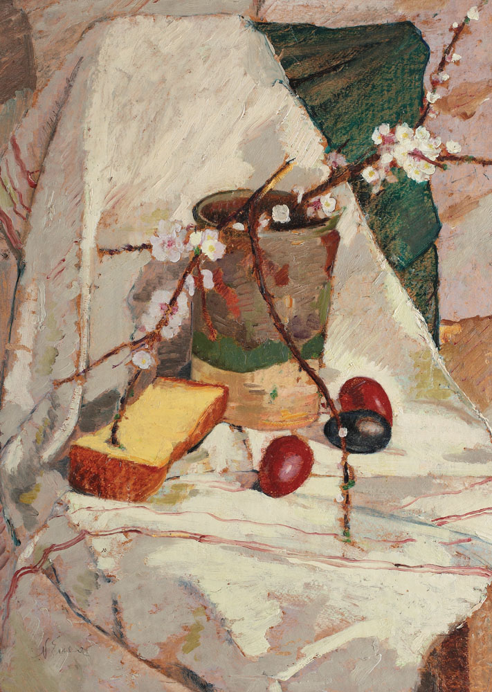 474. Natură statică cu felie de cozonac și flori de măr [sfârșitul anilor '30]