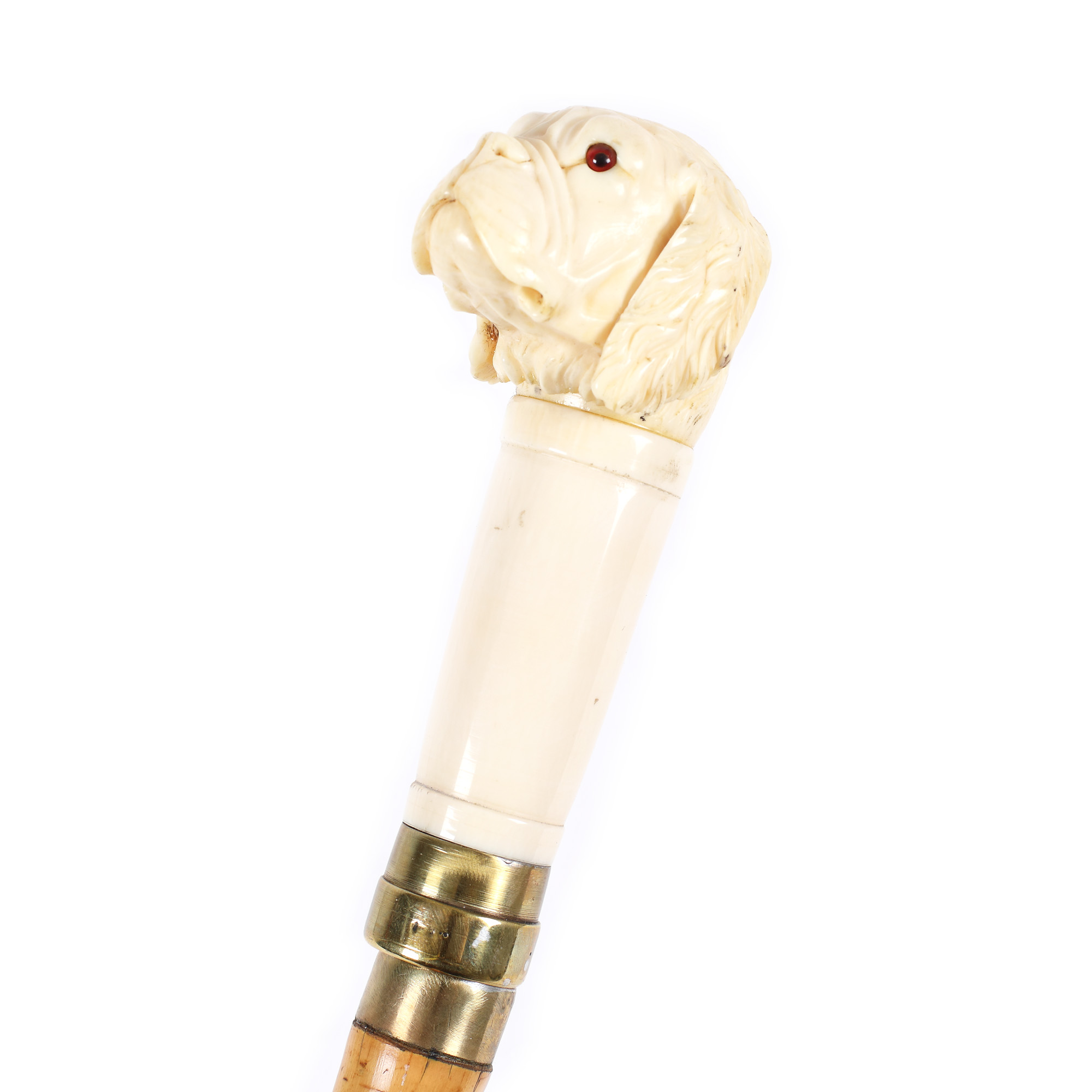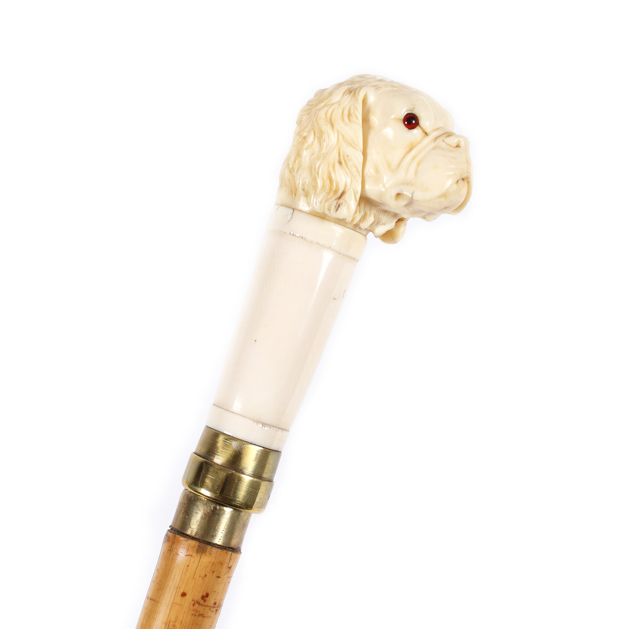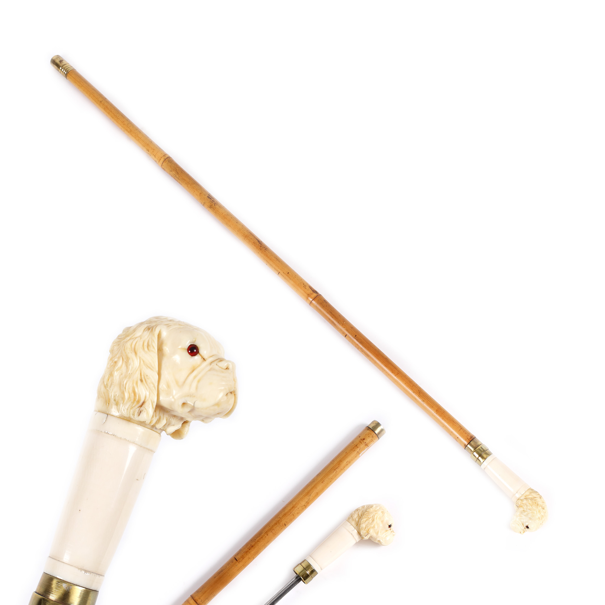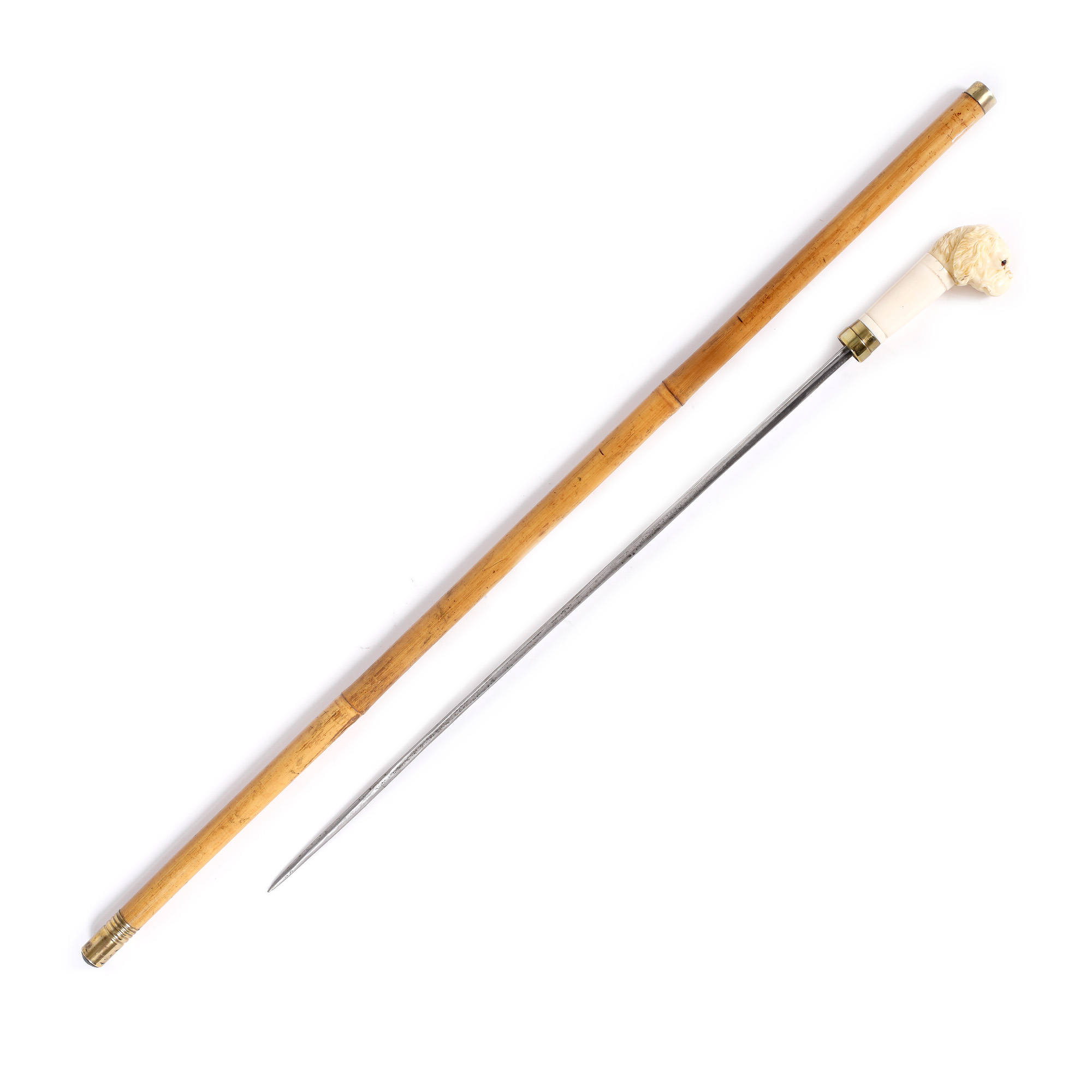 64. Baston cu stilet, din bambus și fildeș, decorat cu figura unui buldog, cca. 1900