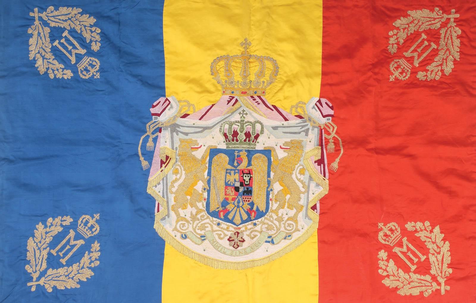 72. Drapel tricolor, cusut cu fir de aur și de argint, cu stema regatului și cifra Regelui Mihai I, piesă de colecție